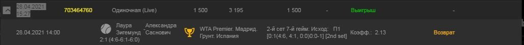 Ну, вы же на явную ошибку поставили. Зигмунд была явным фаворитом и 7-й гейм был на ее подаче. Откуда там может взяться коэффициент 2,13? Возврат ставки в данном случае в рамках правил.