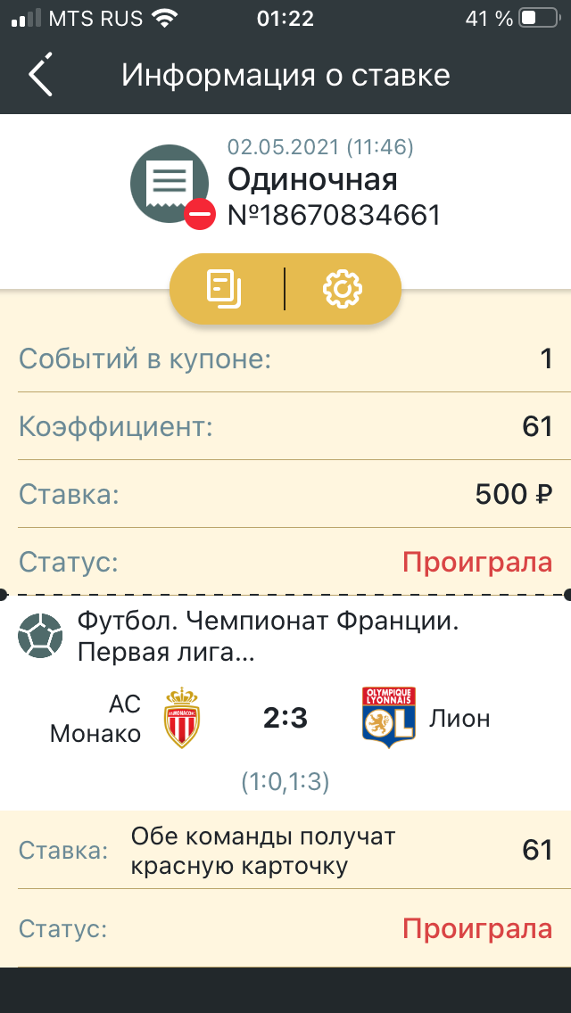 Здравствуйте.По купону №18670834661 не согласен с его расчетом, так как обе команды получили красные карточки. Привожу ссылки на официальные источники, в которых это указано: Франция-Франция-1-2020-2021-Монако-Лион