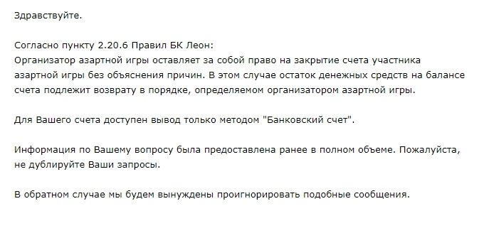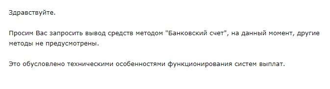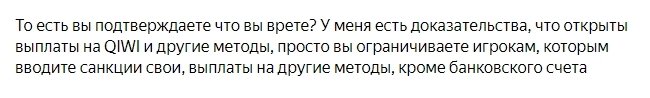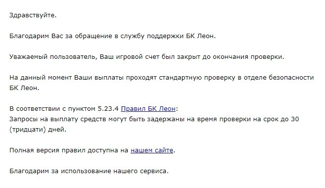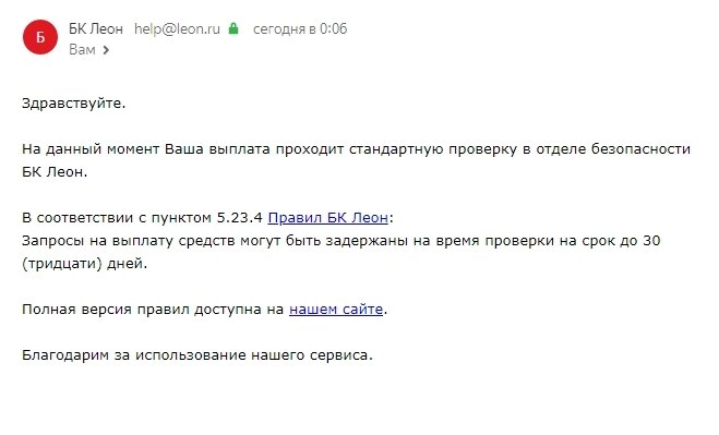 Сначала закрыли мне вывод на кошелек Киви, с которого делал пополнение(с чего бы это вдруг?), был вывод только на банковский счет, потом запросили подтерждение личности. Ну ок. Отправлял, всё что требовали. В результате устраивают какую-то проверку до 30 дней! Ставок при этом у меня было не много. Почти вся сумма на аккаунте - это мои депозиты. Я выиграл только что-то около 5000. Если они считают, что это норма для контор, то нет. Начитавшись отзывов и жалоб, понял, что я не один такой. Это вообще массовое явление. Они даже онлайн чат закрыли) Просто убрали его, потому что, видимо, очень много недовольных. Контора СПЕЦИАЛЬНО задерживает выплаты клиентам до 30 дней, типа проверяя документы) Это просто новый лэвэл наглости.