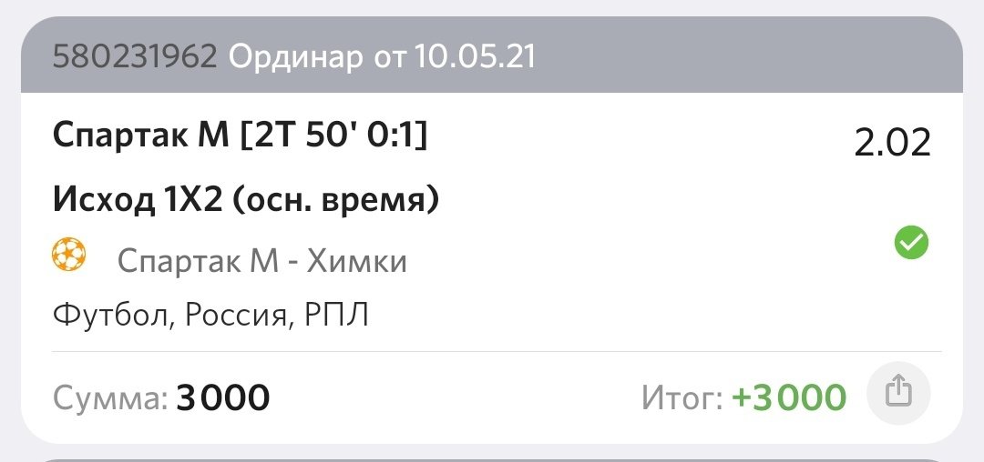 На событие Спартак М - Химки при счете 0-1 в пользу гостей сделал ставку 3000 р. на победу Спартака в основное время с коэффициентом . По итогу матча (Спартак выиграл 2-1) контора делает расчет с коэффициентом 1. На просьбу в чате сделать перерасчет пари мне отвечают отказом сославшись на некорректный коэффициент. При том, что в других конторах, напр., в Лиге Ставок и 1ХСтавке коэффициенты в этот момент времени были даже немного выше: 2.1 и . Прошу дать вразумительное объяснение в отказе в выплате выигрыша. С конторой работа. достаточно давно, были с их стороны косяки, но обычно всегда принимали очевидные доводы, поэтому и был удивлен таким ответом и беспардонным действием.
