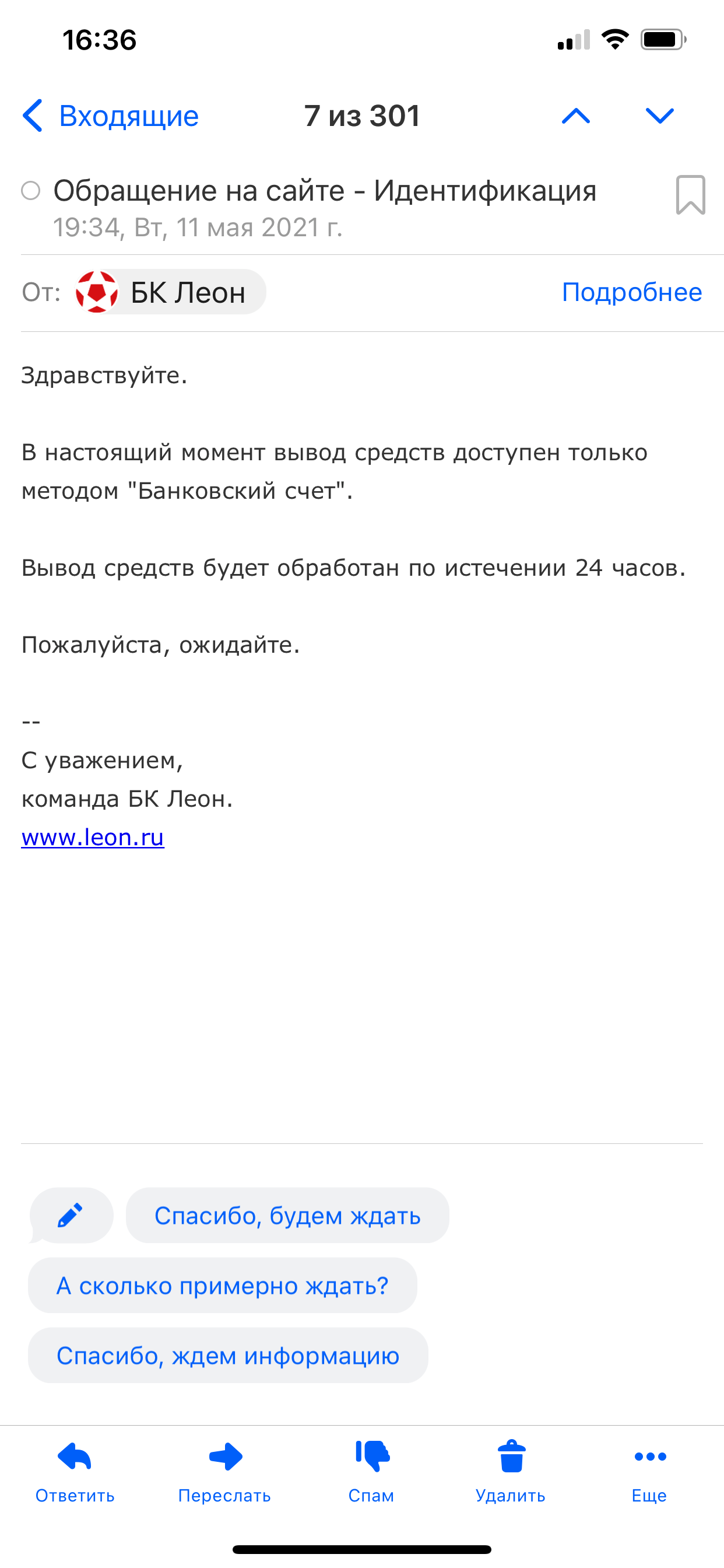 В общем, ситуация такая, люблю ставить на матчи, которые по времени не долго идут, либо же в конце матча уже рискую иногда Так вот, понравился хоккей, 3х10 минут, где забивают буквально за пару минут несколько голов, по статистике, практически каждая игра больше 10 голов, люблю ставить на Тоталы и форы по статистике сильных команд В общем ставил, проблем никаких не возникало, даже выводил пару раз 15 тыс и 3 тыс в итоге, когда решил вывести ещё раз, запросили верификацию, фото с паспортом, с листочком (леон, дата), фото банковской карты, инн, и тд После всех документов, которые я им предоставил, попросили справку о составе семьи, банковский договор, справка из домовой книги. Сразу предоставить им эти справки я не мог, так как были майские праздники, в итоге дождался 11 числа, съездил в паспортный стол, забрал справку, отправил им, написали мол: « Благодарим Вас за предоставленные документы. Процедура подтверждения личности пользователя пройдена успешно. Для изменения статуса в аккаунте, пожалуйста, обновите страницу своего игрового счета. »И я думаю, ура, наконец то! Но не тут то было, вывод можно произвести ТОЛЬКО на банковский счёт, думаю, ну ладно, не страшно, банковский счёт имеется В итоге, деньги с утра висят на выводе, уже вечер, но никак, ничего не пришло, сдаётся мне по отзывам остальных игроков, что ничего я не выведу.... Запрошено на выводе сейчас 51300, до этого было больше, но был матч, отменил вывод в 10 тыс, решил поставить, и проиграл, теперь же, стараюсь на ставить, и вывести хотя бы эту сумму😐 Прошу пожалуйста решить проблему, на мне висит кредит, которые уже с просрочками, хотелось бы как можно быстрее вернуть выигранные деньги. Номер счёта: 64782816