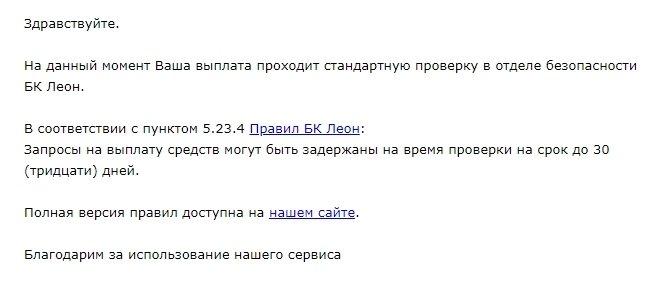 Но это не меняет всего сказанного. Конторы любят вставлять палки, выводя только по банковским счетам. Это и дольше, и не каждый банк предоставляет пользователям банковский счет. Может, еще придется открывать его. Не знаю, что здесь произошло в Леоне, но в БК с Первым CUPIS это стандартное применение. Так было и в ЛС, и в Winline, и в Мелбет. Считаю, что применение такой практики ненормально - требовать заводить банковский счет, связываясь с какими-то банками, только ради возвращения своих денег.