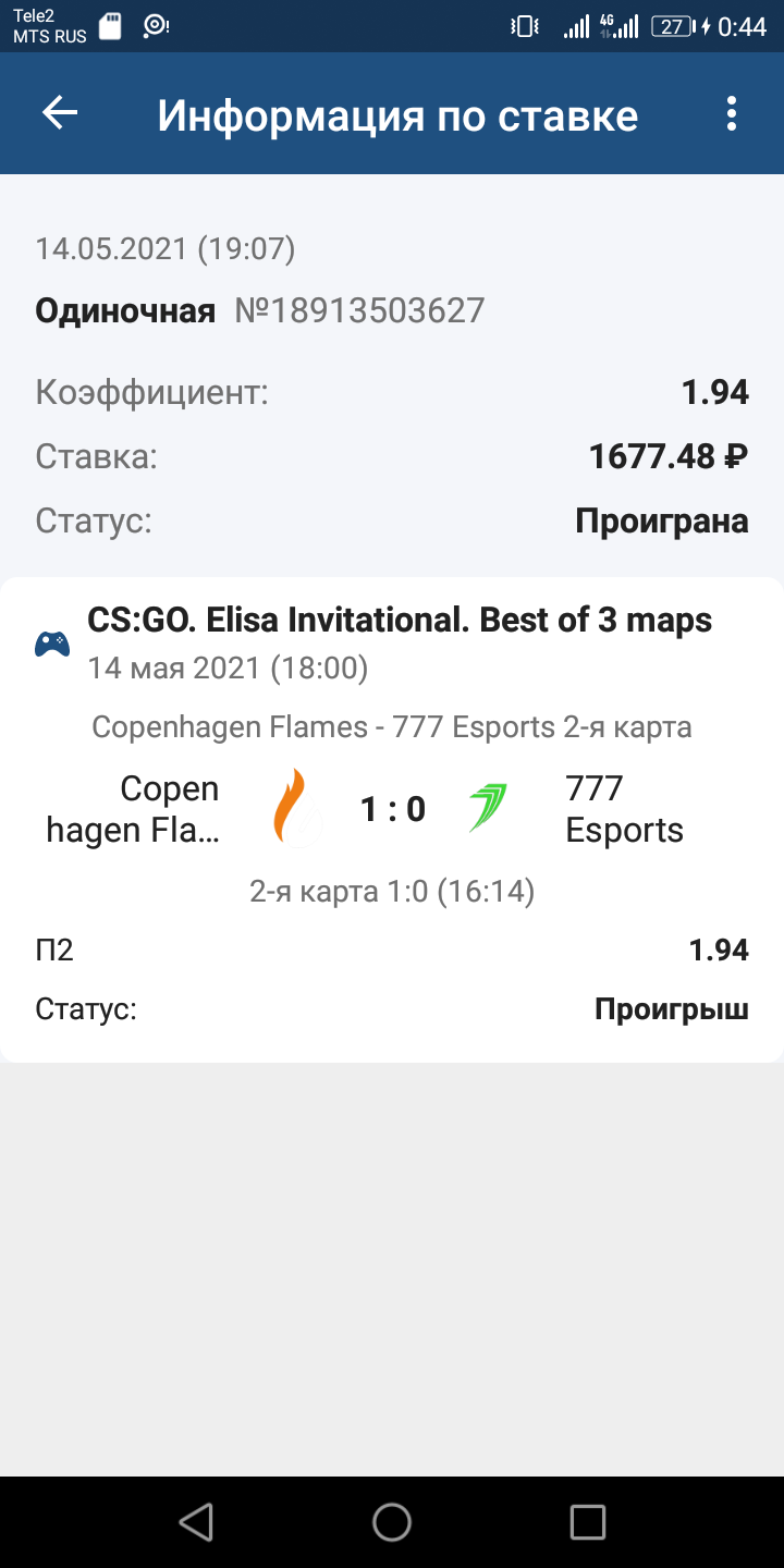 Есть только сам скрин ставки, я думаю если бы моя команда на которую я изначально поставил проигрывала 4-0 на нее такого коэфициента не было бы, там же можно отследить по движению коэфициентов?