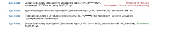 Запрос на выплату через ЦУПИС(Банковские карты, 437772******8429), транзакция - 8377086, на сумму 14500,00 руб.