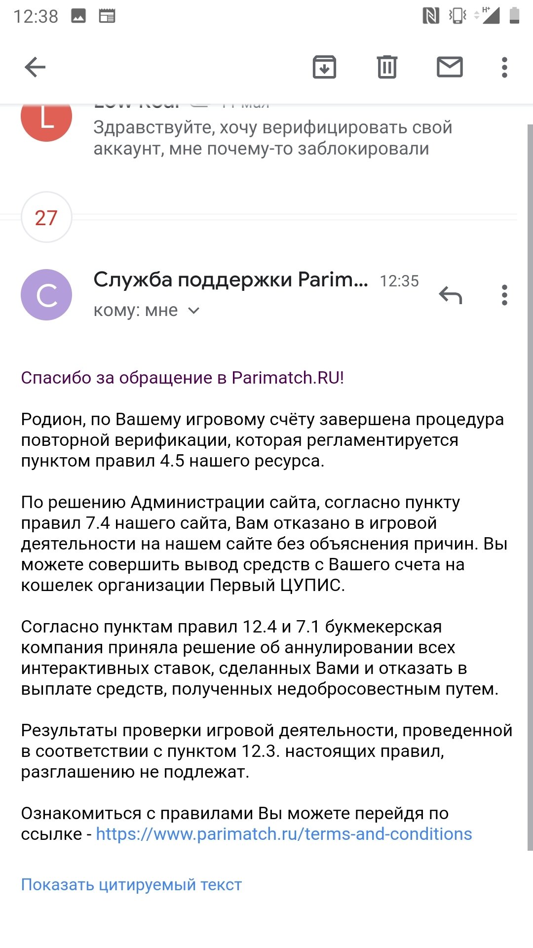 Выиграл 42 223 рубля, попросили повторную верификацию, все фото отправил, попросили дополнительно квитанцию коммунальных услуг за последние 3 месяца, отправил, в итоге приходит ответ сегодня, спустя неделю(приложил) есть возможность вывода только 7600 Вывожу теперь 7600 Это все при том, что мой аккаунт все равно быль в убыль мне, я потерял на нем больше денег, зато победную ставку мне дали забрать, спасибо большое, париматч(сарказм) Надеюсь это жулье лишат лицензии и вернуть мне деньги, прошу вас помочь в решении проблемы