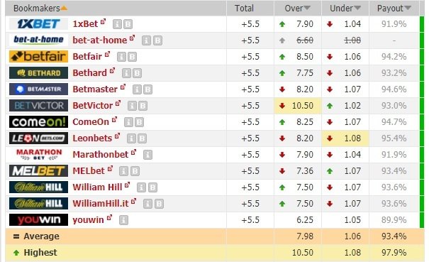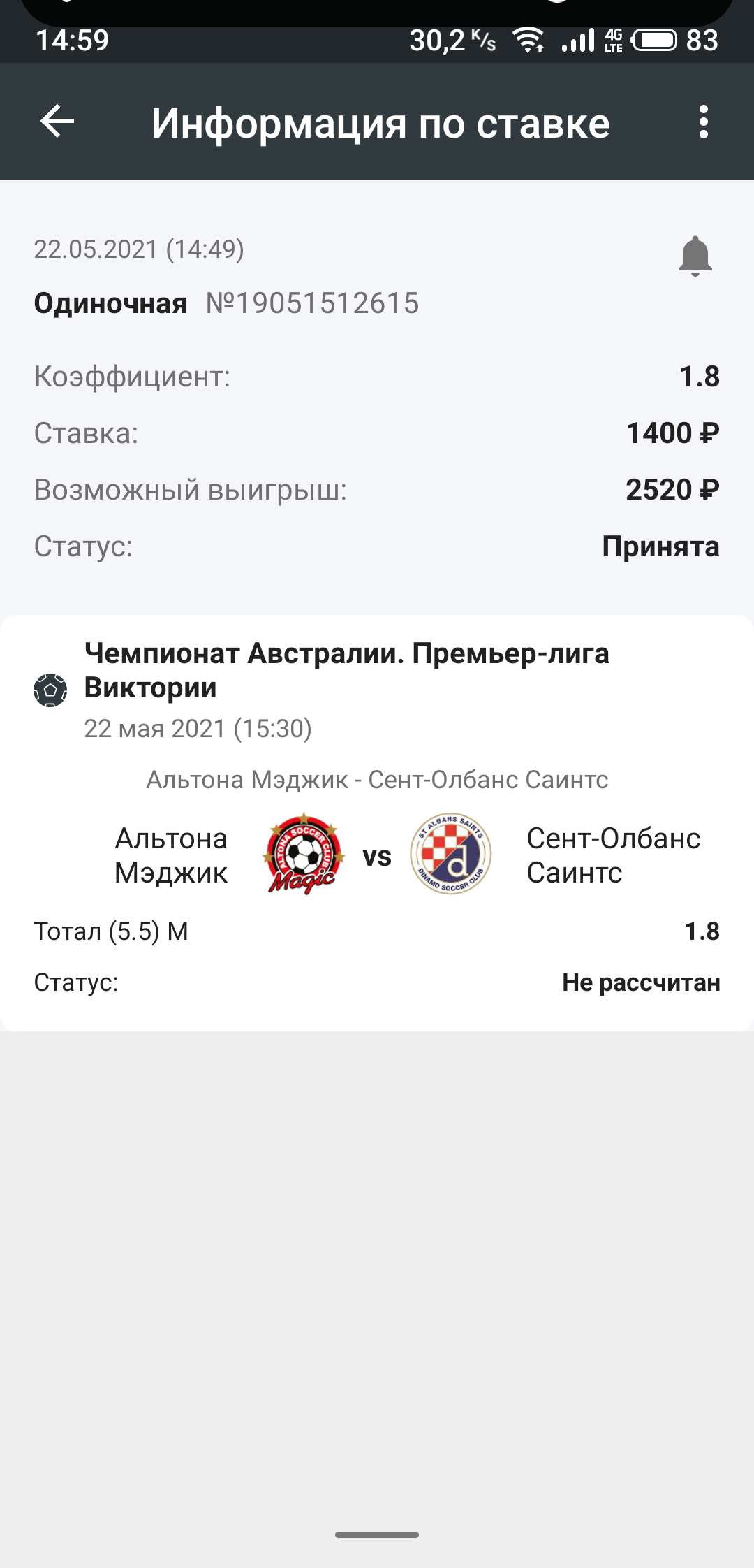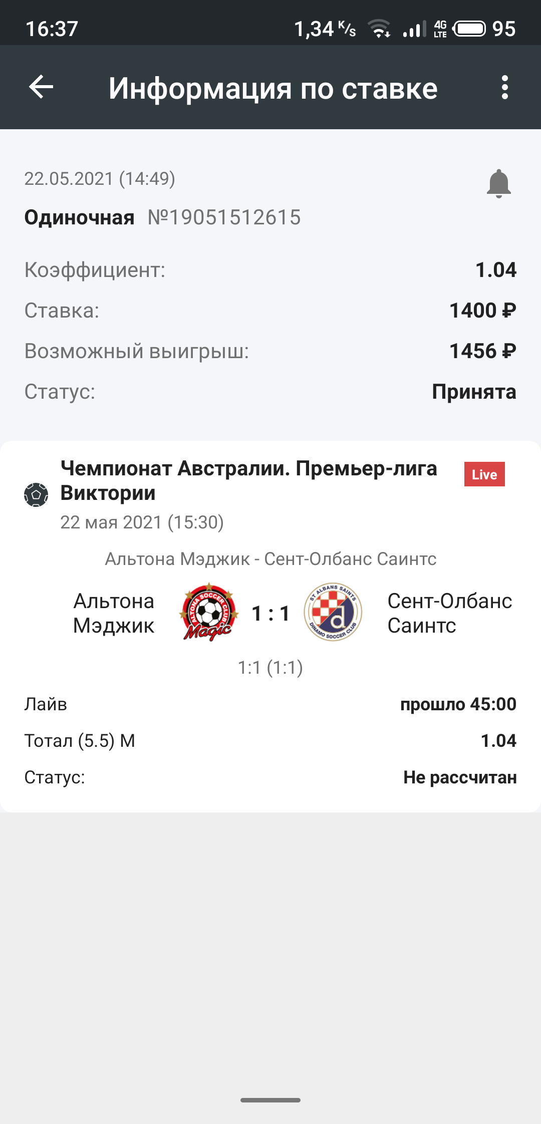 Поставил на матч тотал меньше 5.5 кф 1.8, сделал скрин ставки, через час захожу кф .