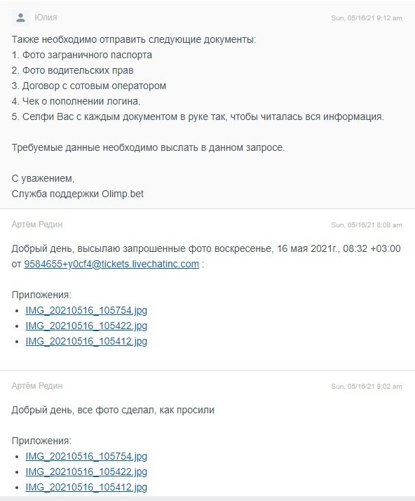 Добрый день, legalbet! Столкнулся с очень неприятной ситуацией впервые. Прочитал у Вас в жалобах кучу ситуаций 1в1 как моя. Прошу помочь. В БК ОЛИПМ БЕТ с попытаюсь вывести средства, но мой счёт заблокировали и просят подтвердить личность и высылать фото то с паспортом, до с договором от сотового оператора , поддержка отвечает отписками. Фото с паспортом им было выслано. Идентификация по средствам whatsapp пройдена успешно. Только кучу документов запрашивают и фото с ними. Очень надеюсь на Вашу помощь. Мой логин в БК ОЛИМП 3987005.