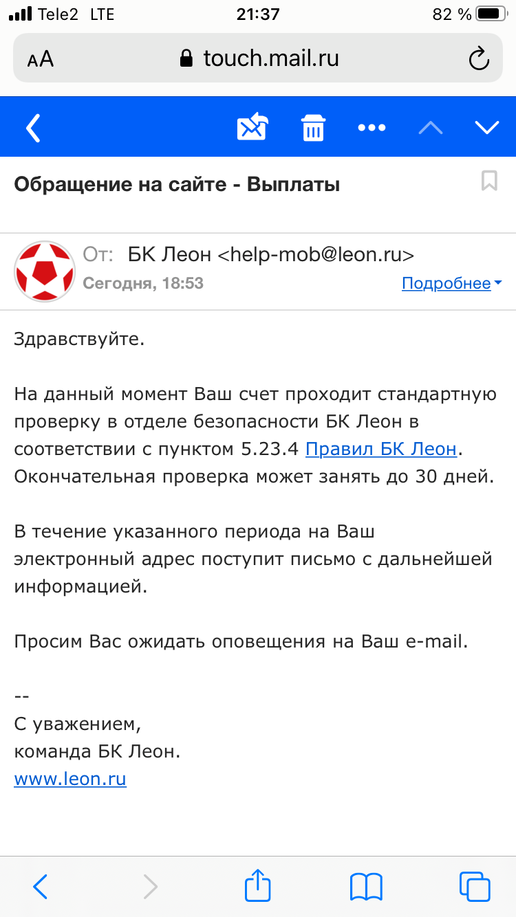 Здравствуйте, уважаемый легалбет! Бк Леон без обоснования вязала и списала у меня выигрыш в размере ₽. Как было это. Зарегистрировался, пополнил картой ₽, поставил на гандбол в лайве Скиф-Премские медведи П1 за большой кф, не знаю почему был большой кф, они вели 4 очка, поставил несколько ставок П1 и плюсовую фору. На следующий день захожу в бк, а там сообщение подтвердите личность. Я начала все сделать, запросили много разных фото, но я думаю в вузе знаете какие, все отправил, а в конце приходит сообщение, что вас счёт заблокирован и выигрыш мы забираем с 5% депозита. Вот у меня вопрос, зачем контора себя так ведёт? Что я сделал чтобы красть мой честный выигрыш? Я все документы и фото предоставил, как они просили, в они просто взяли и в наглую украли мой выигрыш, помогите решить данную проблему пожалуйста