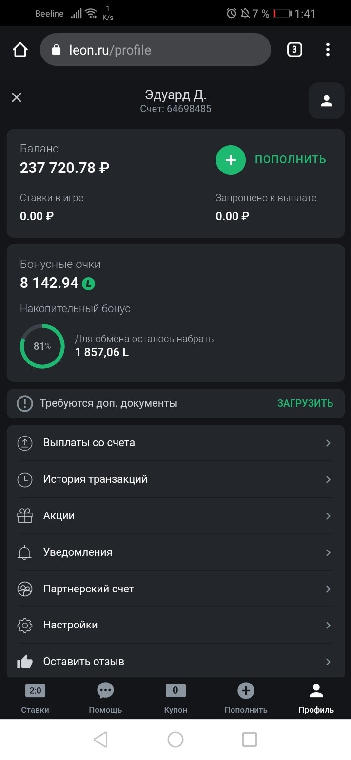 Бк leon развод контора которая сначала даёт вам поднимать деньги и как ваш баланс аккаунта привышает больше 20т.р сразу высылают верификацию счета. После чего не дают вывести деньги со счета и просят документы на подтверждение вашей личности и просят помимо паспорта много лишнего,когда уже могут и так проверить что это вы. Не пользуйтесь этой убогой конторой. Пусть гнеют.