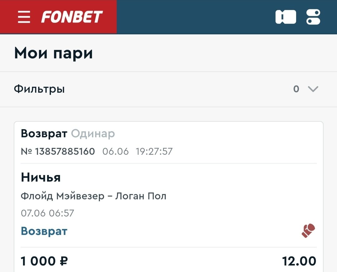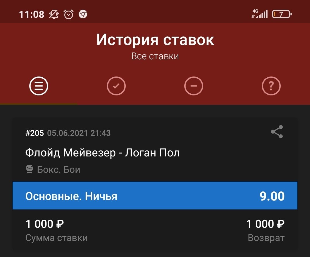 Была сделана ставка на ничью в бою майвейзера - пола По итогу вместо расчета, получена ставка назад