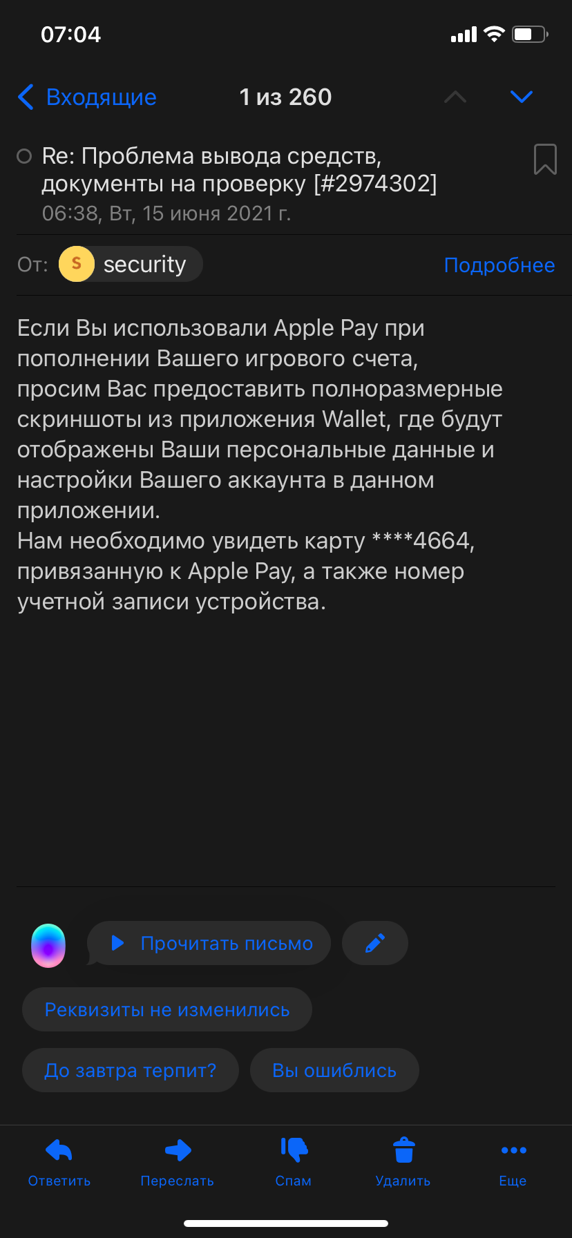 Добрый день, стал очередной жертвой марафона верификации от МЕЛБЕТ. Давно пользуюсь данной букмекерской конторой, не было проблем до тех пор пока не попытался вывести крупную сумму. Накопив почти 400тыс попытался вывести часть (₽) пришёл сразу отказ и просьба написать по майлу в службу безопасности, они в свою очередь выслали требования отправить фото паспорта, незамедлительно отправил, вот уже 2-е сутки судорожно жду от них ответа, почитав комментарии по данным процедурам сделал вывод, что ждёт меня не простая дорога. Прошу помочь с данной процедурой, потому-что у меня могут быть загвоздки с фото карт который они по всей видимости попросят у меня, дело в том, что внесение средств я производил с 2х карт и все через PayPal, а вот на руках у меня только одна из этих карт, вторая была испорчена, я конечно сделал перевыпуск второй карты, но номер карты ведь поменяется, и уже будет не соответствовать той, с которой я делал пополнение, как быть - не знаю.