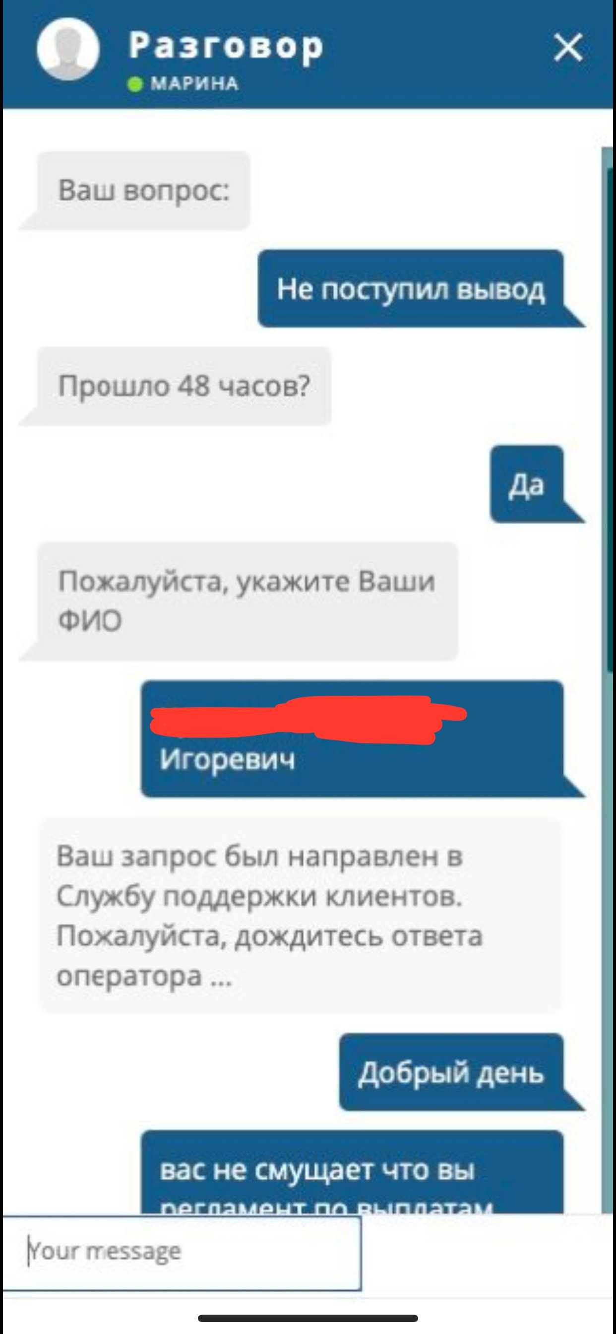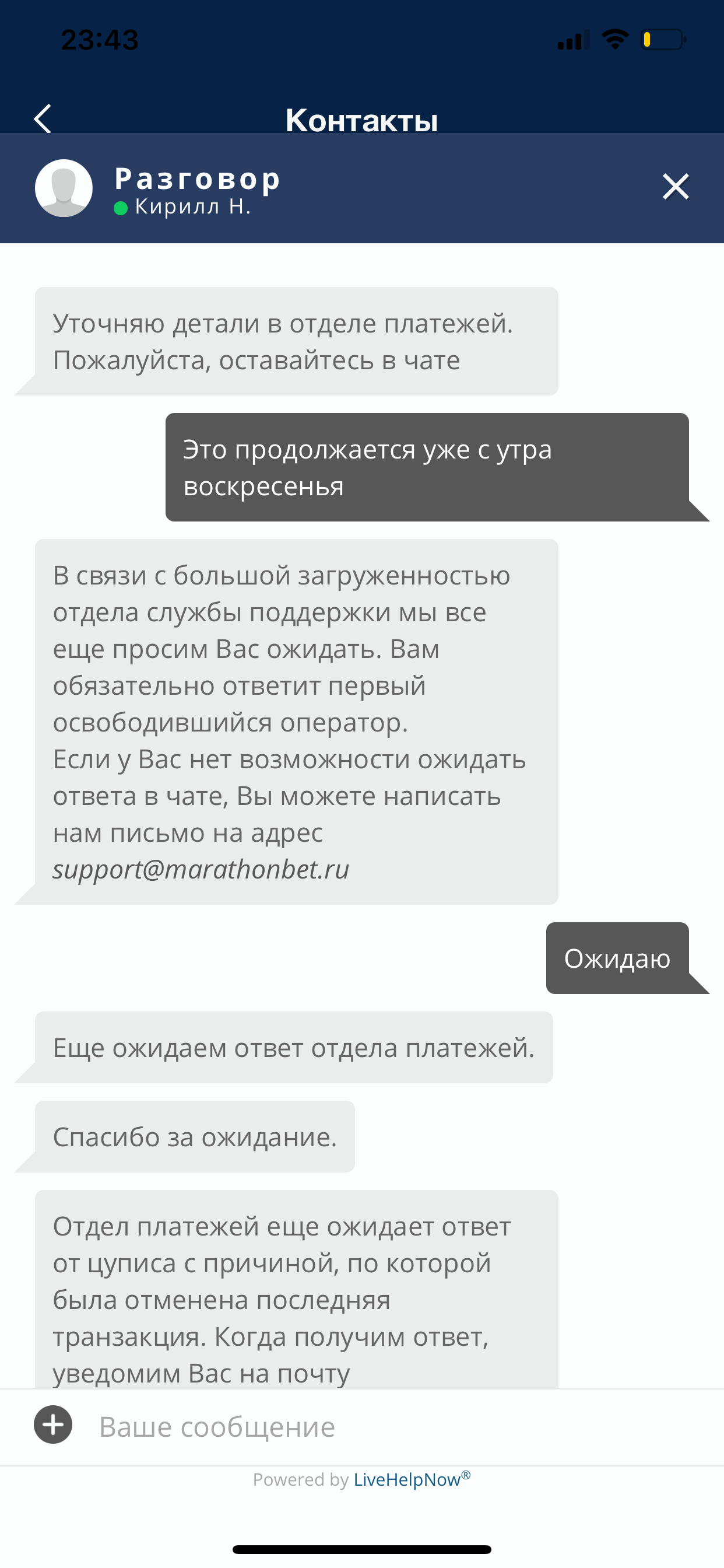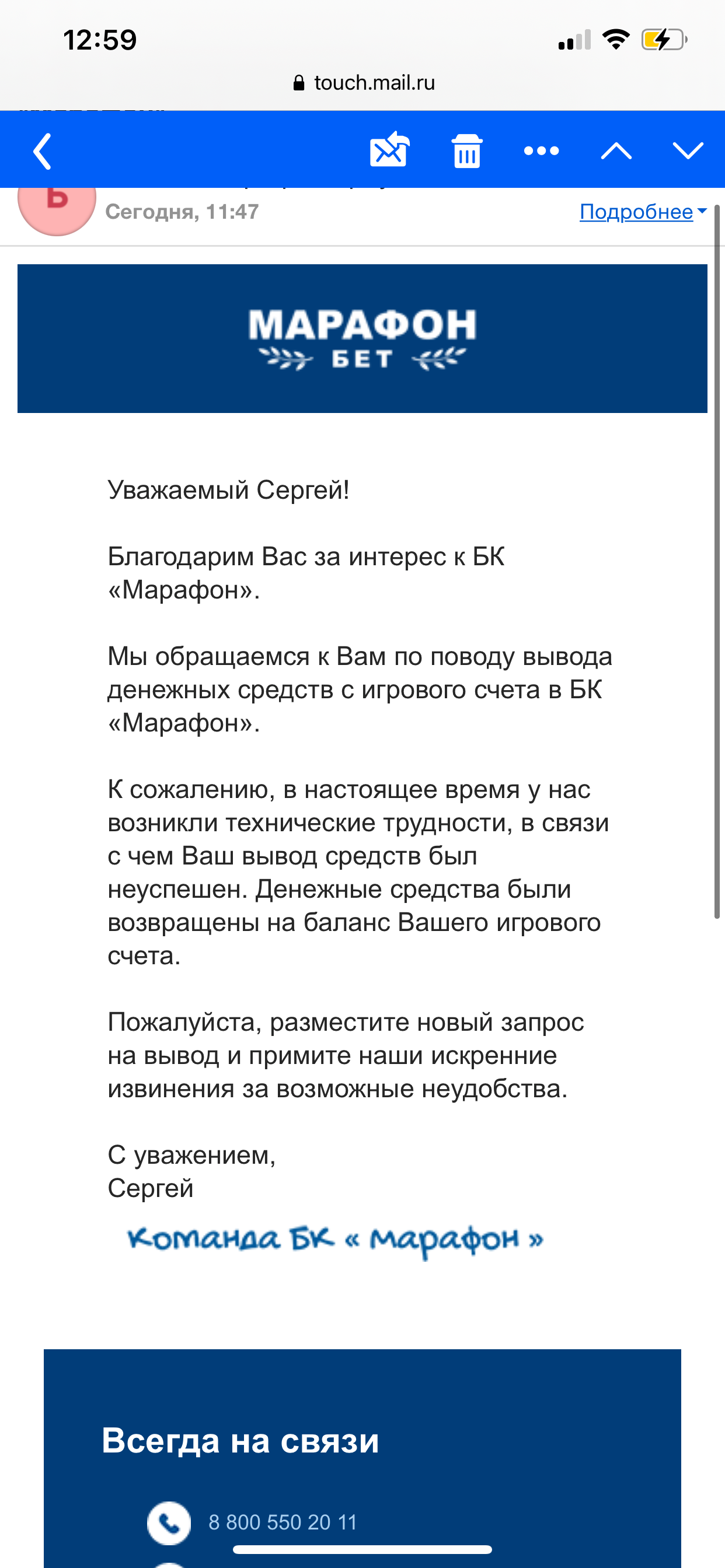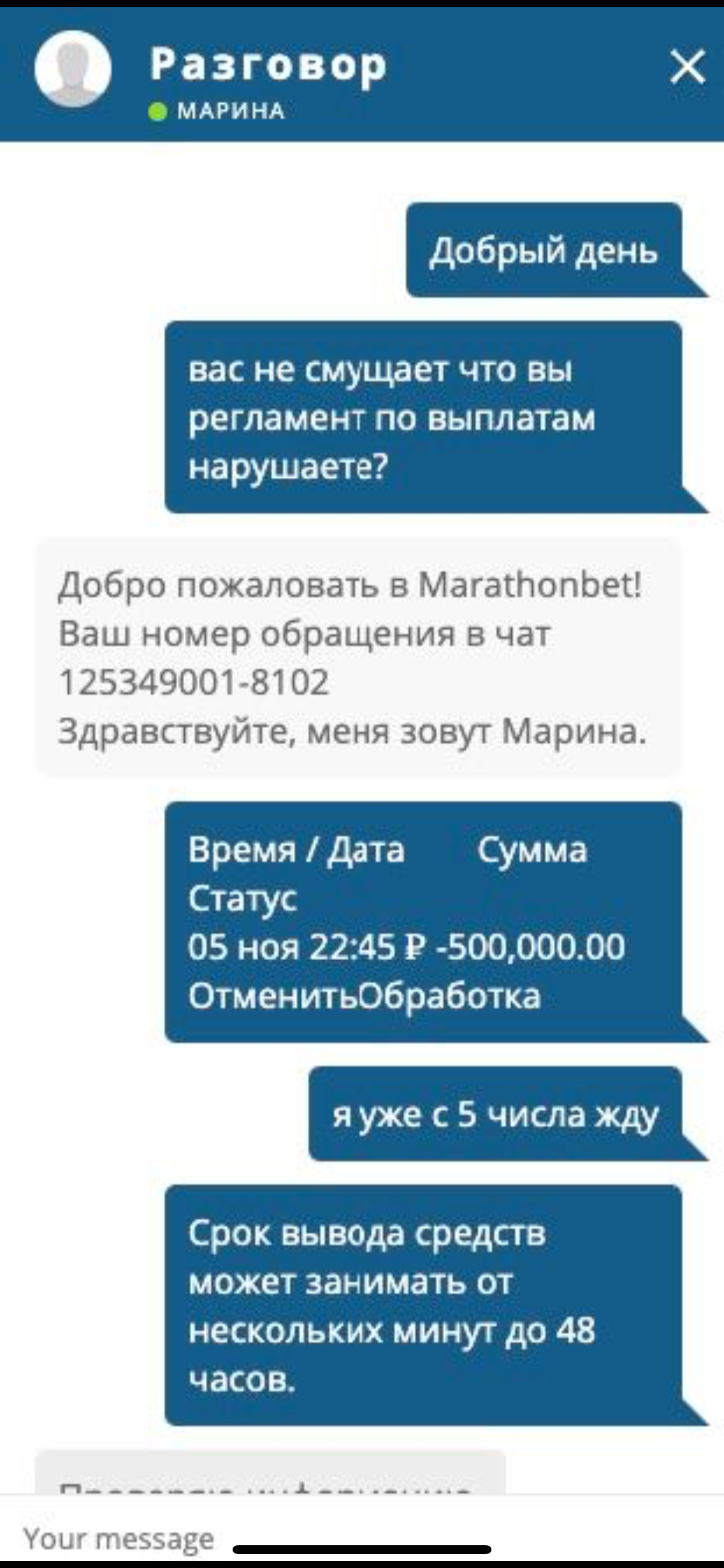 Доброй ночи! Компания марафон бет не хочет отдавать честно заработанные деньги, на счету в данный момент более около 9млн руб, при попытке вывода средств начинаются всяческие задержки, сначала всячески тыкают в правила, что вывод может занимать до 48 часов, потом сетуют на технические проблемы, мол проблемы с контрагентом который обслуживает выводы ( у такой конторы должны быть несколько поставщиков для вывода средств поэтому не верю), последний вывод на карту запросил более 48 часов назад, он был отменён поэтому нарушение регламента самой конторы(в процессе было ещё несколько запросов они так же отменены), все что удалось добиться за 3 суток вывода на киви 500к руб двумя платежами, это не нормально при таком крупном балансе, месяц назад была похожая ситуация при крупном балансе на счету, тех проблемы с выводом и лимиты, напрашивается только один вывод, безразличное отношение к клиентам, тем более к таким крупным, во всех других конторах я вип клиент и со мной всегда менеджеры на связи и решают или проблемы и не морозят мои деньги, в марафоне я вижу полный пофигизм, попробуй вывод завтра, попробуйте может вывод пройдёт, никак не можем ускорить данный процесс, короче ваши проблемы это ваши проблемы, звонил и писал десятки раз, в ответ шаблонные ответы, проблемы, ждите, попробуйте через время и тд, в итоге 0 решений и даже никто не позвонил мне, на лицо видно специально подмораживают вывод, что бы я играл дальше и все просрал, в нормальных организациях если тех проблемы то закрывать вывод совсем, а тут никаких оф заявлений и закрытия, просто выборочные выплаты кому надо платят, кому не надо нет (как в финансовой пирамиде), беспредел чистой воды, есть все пруфы, готов предоставить, и сразу предупреждаю я все зафиксировал на счете, если что то произойдёт будем судиться, прошу повилять на данный беспредел !!!