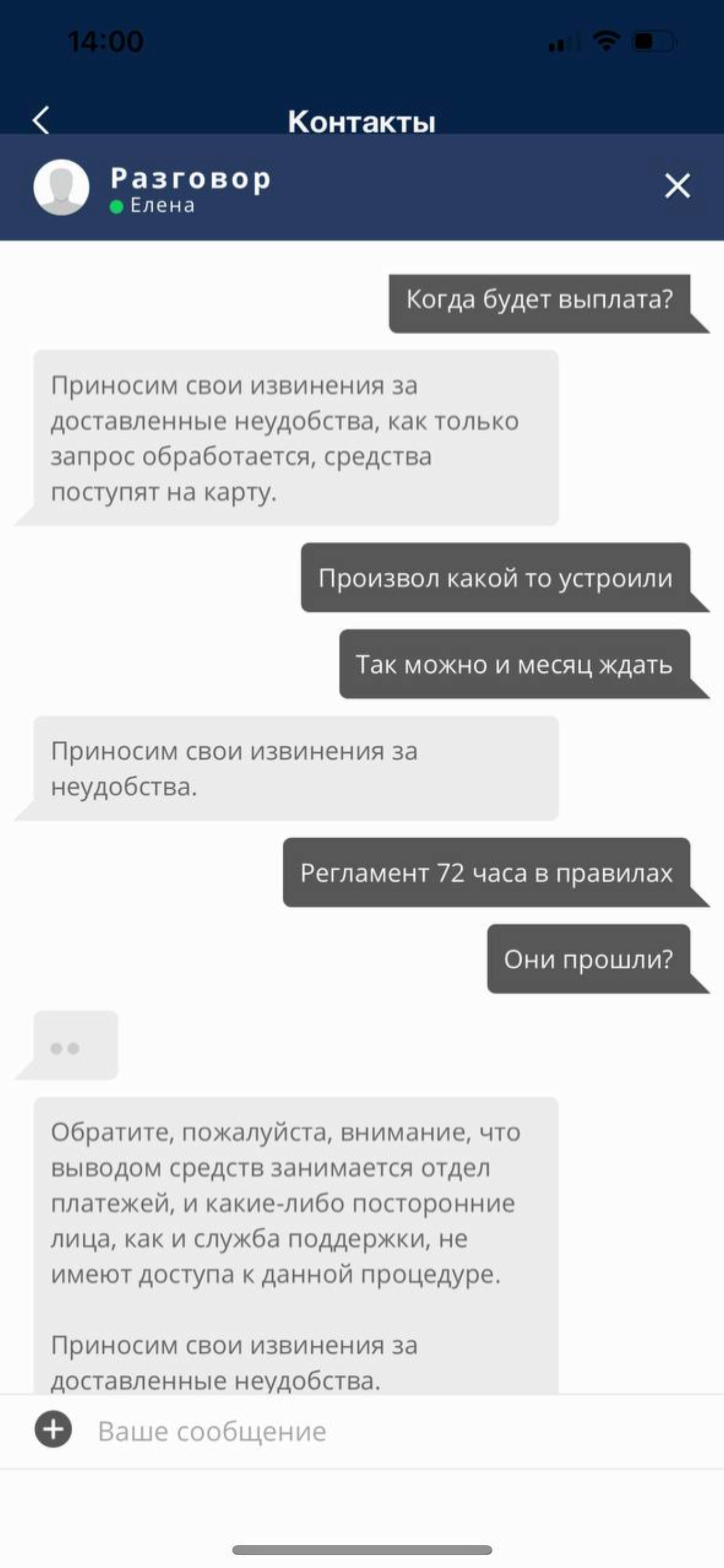 Поддержка ссылается на отдел платежей, отдел платежей говорит какая то проблема у них, конкретики сказать не могут (это последние 2 дня говорят) просто ожидайте, сроков никаких не дают. Говорят массовой проблемы с выплатами никакой нет, все происходит индивидуально…