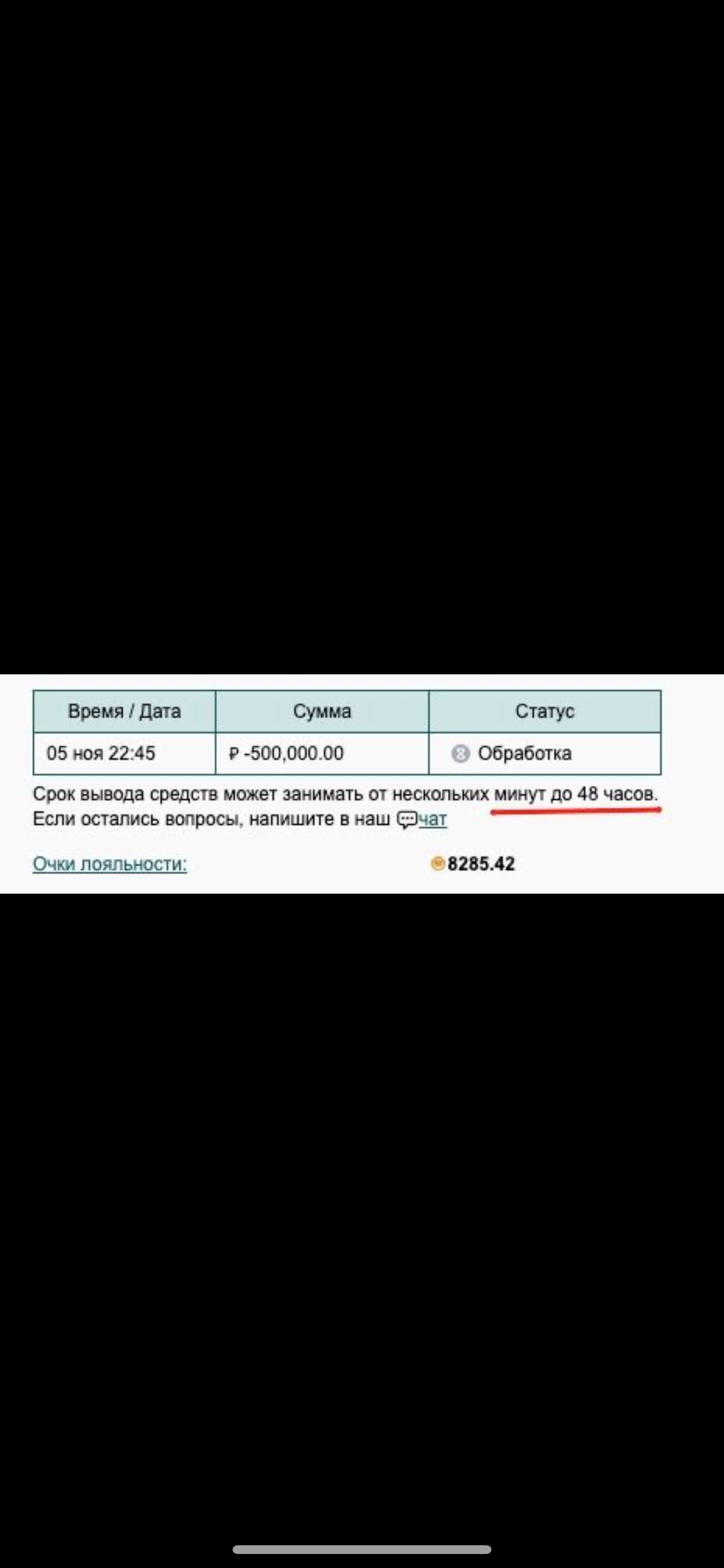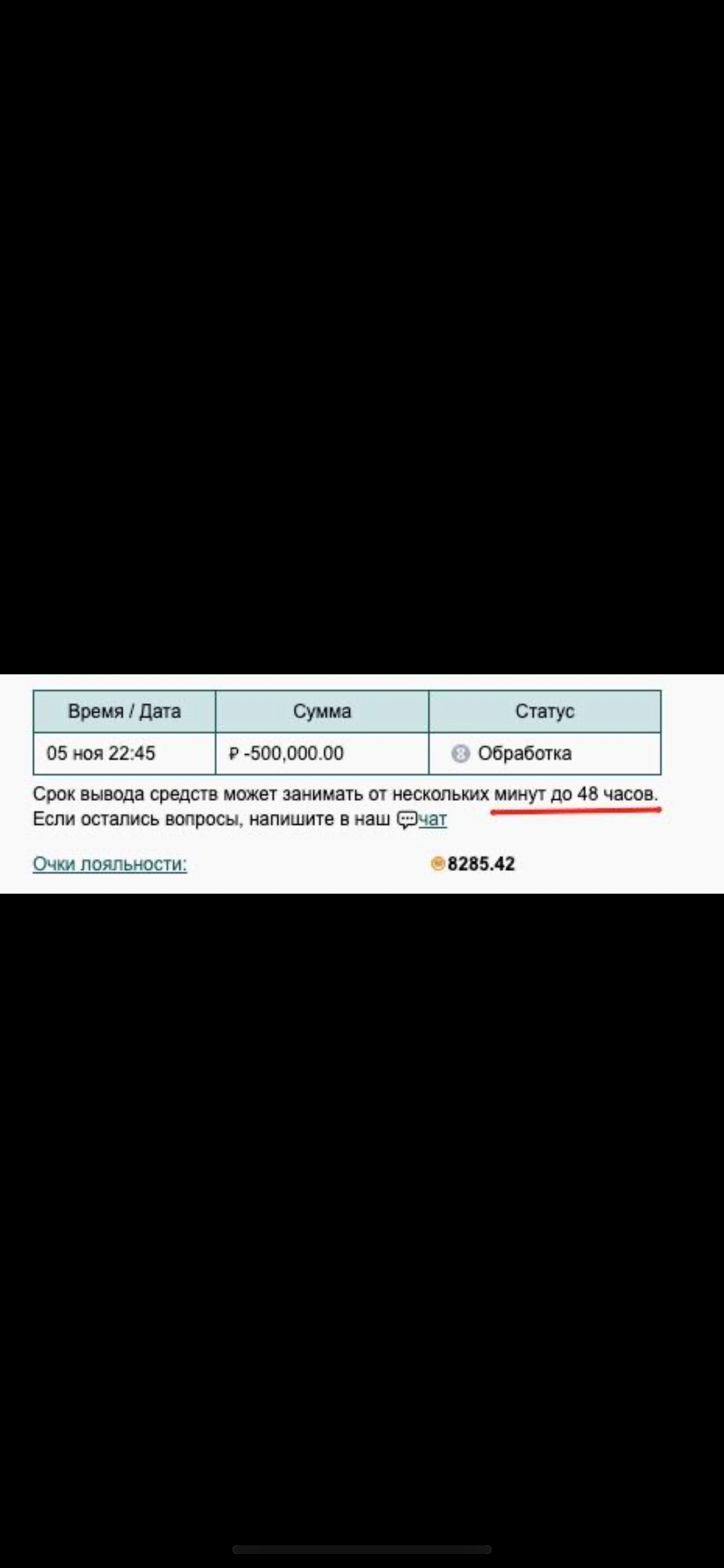 На сайте указан регламент 48 часов, в чате тоже 48 часов, оператор утверждает, что недавно регламент расширили до 72 часов, я спросил почему на офф ресурсах указано 48, он ответил, что в правилах 48)) ну смех честно, называется - на одном заборе написали одно, на другом другое, где правда решите сами…