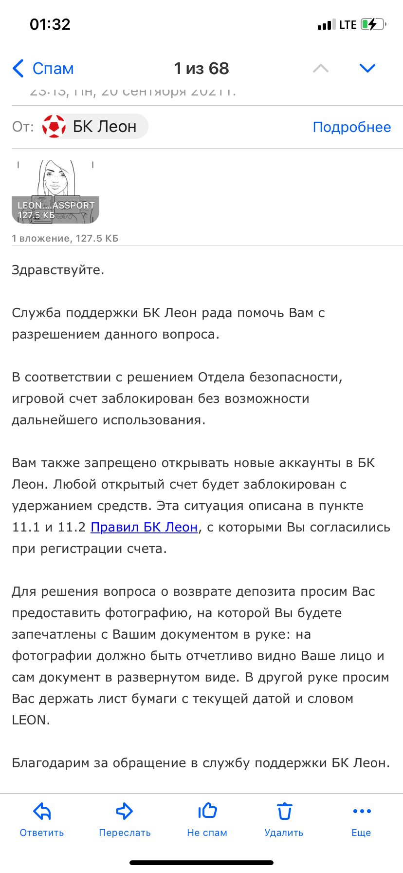 Здравствуйте! Вчера сделал первое пополнение на счёт БК ЛЕОН на сумму 910 рублей через банковскую карту(оформлена на меня). Выбрал участие в акции «Бонус на первый депозит». В итоге начал делать ставки,были и плюсовые и минусовые, но в итоге получил бонус (набрал 100%) и решил вывести. Накопленная мной сумма-1538. Сегодня решил вывести деньги на карту(опять же на свою) пришёл код на номер(мой же),на который я так же зарегистрирован был в БК ЛЕОН. Так же указал адрес проживания-фактический.Прошло около 15 минут и я вижу,что не могу зайти на свой аккаунт,так как он заблокирован.Написал в поддержку-ответ следующий:ваш игровой счёт заблокирован. Помогите решить проблему пожалуйста,ведь у меня один аккаунт и все данные(номер,карта)-все оформлено на меня и только на меня. Готов пройти любую верификацию. И так же сообщу,что ранее ни в одной БК,таких проблем у меня не было! Помогите решить проблему пожалуйста!