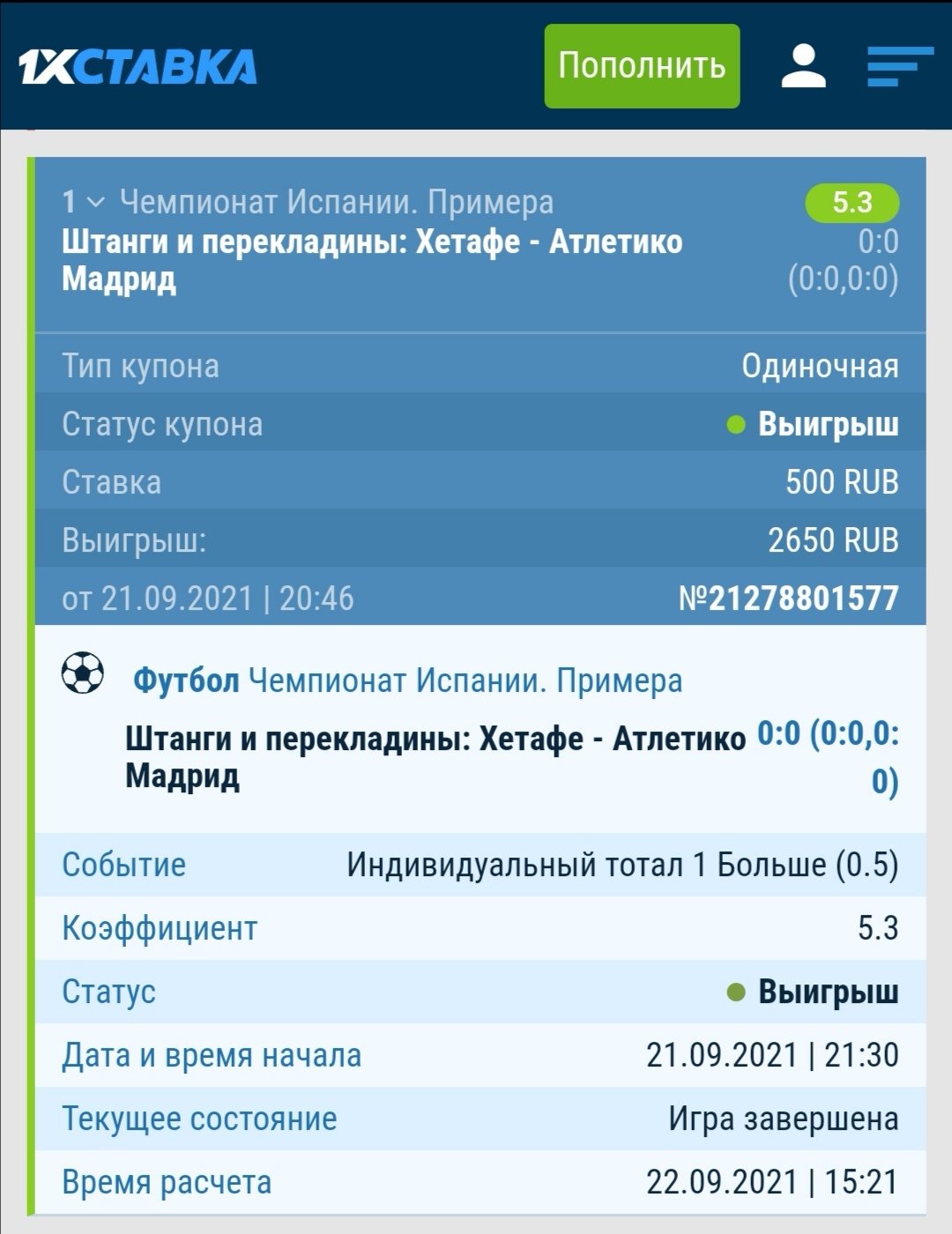Неправильно расчитына ставка букмекерской конторой 1хСтавка. года, хетафе - атлетико, тотал штанг и перекладин первого больше 0,5. На 45 минуте когда забивался 1 гол мяч после удара игрока Хетафе попал в штангу, ЗАТЕМ МЯЧА ДОТРОНУЛСЯ РУКОЙ 🤚 ВРАТАРЬ, и только потом он влетел в ворота. Согласно официальной статистике Испанской лиги, этот мяч засчитан как автогол вратаря Я. Облака. То есть, после попадания мяча в штангу, мяч остался в игре, попал в другого игрока - вратаря, а от него залетел в ворота. Согласно правилам конторы п. 8.1.2 «Штанги и перекладины». В расчет берутся только те попадания в штангу или перекладину (которые были от команды соперника), после которых мяч остался в игре (коснулся игрока, судью, другую штангу или перекладину). Штанга или перекладина не считаются: до попадания мяча в штангу или перекладину игра была остановлена; после попадания в штангу или перекладину мяч ушел за пределы поля или влетел в ворота (был зафиксирован гол). К примеру в букмекерской конторе ФОНБЕТ у Хетафе стоит тотал штанг Хетафе 1.