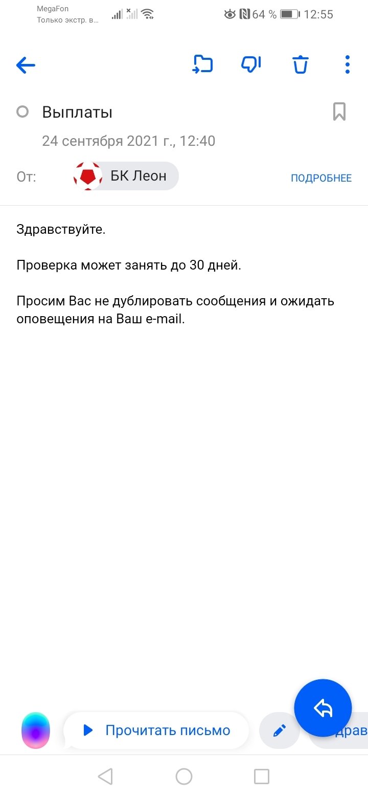 Прошло 10 дней после блокировки счета, нету не единого сообщения о выводе средств и верификации счета. Здравствуйте. Ваш счет проходит стандартную проверку в отделе безопасности БК Леон в соответствии с пунктом .4 Правил БК Леон. На время проверки, которая может занять до 30 дней, доступ к Вашему игровому счету был временно ограничен. В течение указанного периода на Ваш электронный адрес поступит письмо с дальнейшей информацией. Просим Вас ожидать оповещения на Ваш e-mail Вот одни и те же шаблоны, и нет не какого результата. Прошу помощи по выплатам.
