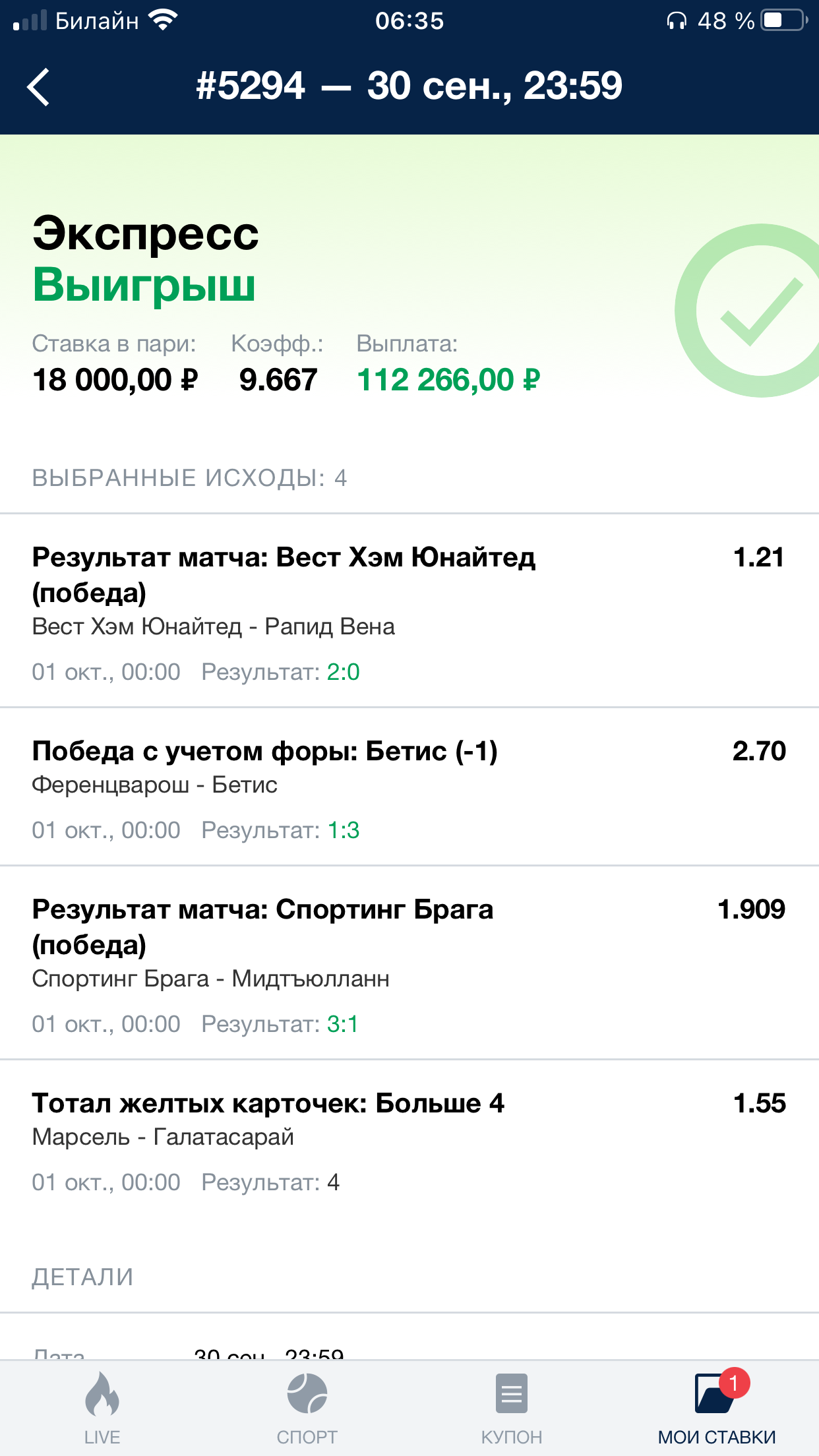Событие в экспрессе пересчитано на выигрыш.