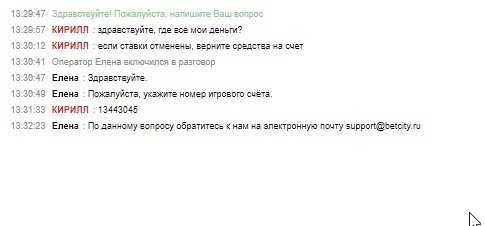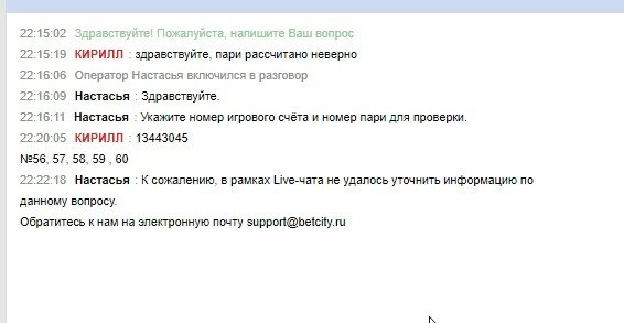 Внезапно, после написания жалобы, уже через 30 минут я смог войти в свой аккаунт. Однако, зайдя в него, я обнаружил отрицательный баланс счета. На вопрос, как, что и почему, а главное, где мои деньги, оператор направил вновь на почту. Скриншот диалога, а также всех пари за последние 2 дня прикладываю