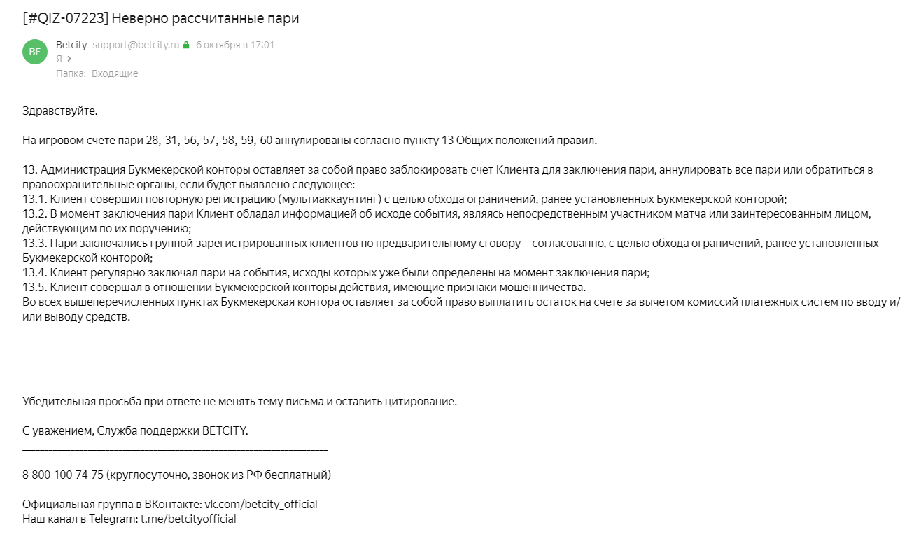 UPD. Вчера написал еще раз в саппорт БК по поводу аннулированных пари (скриншот прилагаю). Ответ последовал уже классический: пишите на почту. Терять нечего, подумал я, а вдруг ответят. И какого было мое удивление - ответили. А ответили следующее, если выкинуть формальности: вы мошенник. Не понимаю, каковы критерии причисления к данной категории, если мультиаккаунтингом я не промышлял, потому что знаком с правилами БК. Да и на события завершенные нельзя сделать ставку. А вот про группу клиентов, которая делает ставки, дабы обойти ограничения - зачем? У меня не было никаких ограничений, я ставил столько, сколько хотел. В общем-то, исход ясен: если ты выигрываешь - БК в праве аннулировать твои пари и сослаться на правила, где тебя выставят мошенником, не доказывая тебе ничего.
