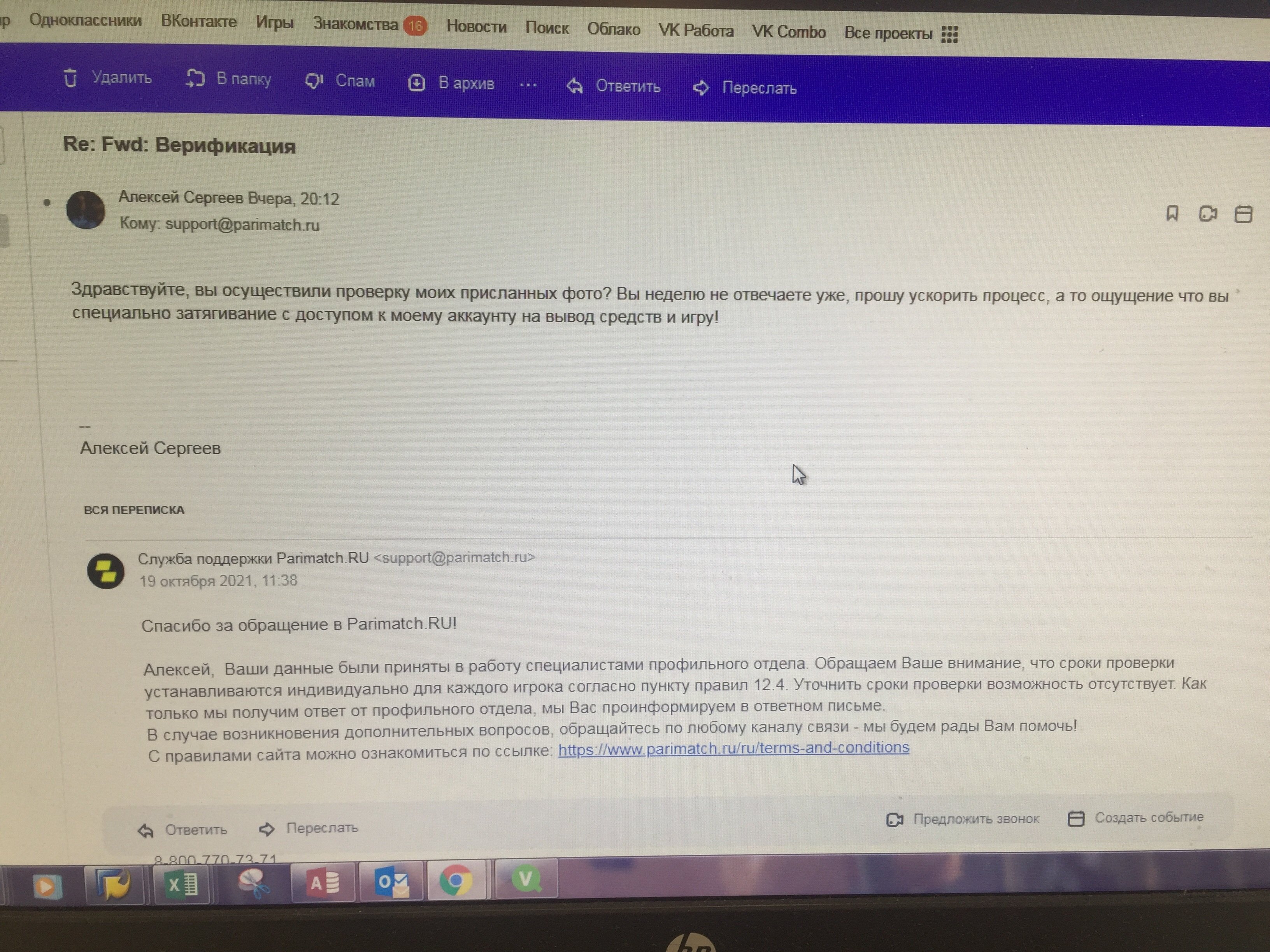 Всем доброго дня. Играю в конторе ПариМатч, недавно поднял около 200к, до этого никаких сдвигов не было, а тут такое и конечно не успел все вывести назначили верификацию. 1. Отправил фото паспорта с листком и датой-прошло, ждал около 5 дней я тут подумал всё, но началось, скажите как сами считаете, я думаю это выживание клиента.. Ужас... 2. Попросили выслать квитанцтю ЖКХ и стр с припиской. Внимание: по прописке я не живу и доступ к людям кто там живёт нет соответственно и получить квитанция не имею возможности, я написал об этом и сказал что живу сам по другому адресу, думал дадут другое задание но мне пришёл отказ и ответ что поедоставляйте что мы вам написали. Подарю жалобу на контору прошу её рассмотреть и помочь открыть доступ к счёту и игре.. 9630970 Сергеев Алексей Сергеевич