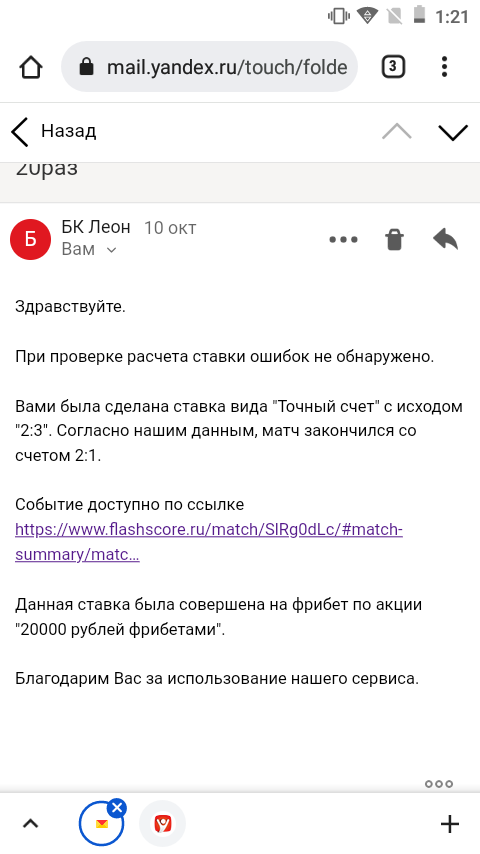 Здравствуйте, я играю в БК Леон, там проходит акция фрибет 1000р за депозит от 500р, один из этих фрибетов я получаю в 19:08, в 19:24 делаю одиночную ставку на лигу УЕФА Бельгия-Франция точный счёт 2:3, ставка сыграла, все условия фрибета соблюдены и не нарушены, но заходя в купон ставки вижу наисанно "проигран" пытаюсь обратится в службу поддержки данной БК Леон, обнаруживаю что на моей странице ни с сайта БК Леон ни с приложения нет функции онлайн чата, в то время как у моих знакомых играющих в этой же канторе такая функция есть, пишу им на почту, предоставляю все скриншоты, объясняю проблему, отвечают спустя примерно 14часов, говорят что все получили, все проверят и ответят в течении часа, ответа так и нет, подозреваю что и онлайн чат был специально отключен, очень прошу разберитесь, ведь играю я честно условия их акции были соблюдены, и почему меня не пускают в онлайн чат тоже не ясно