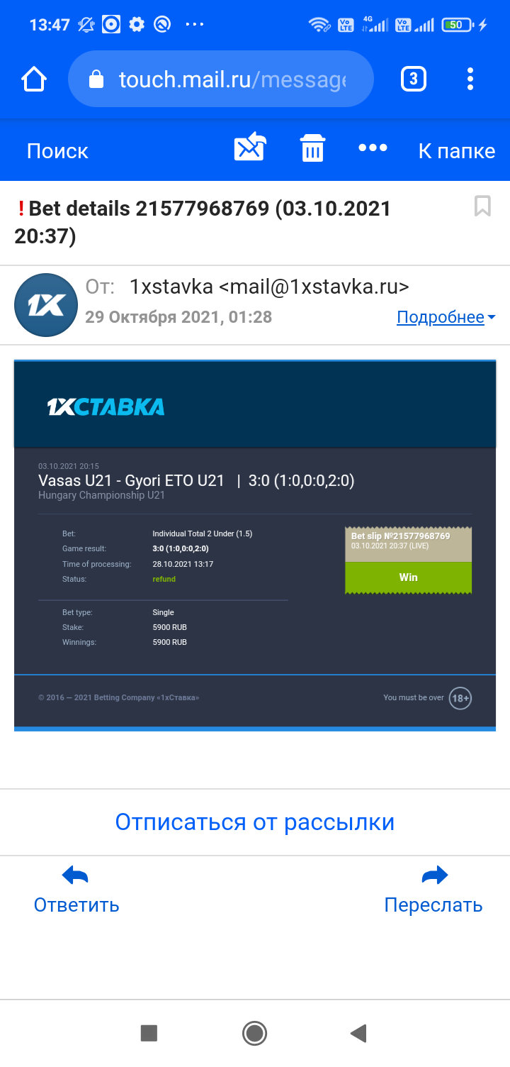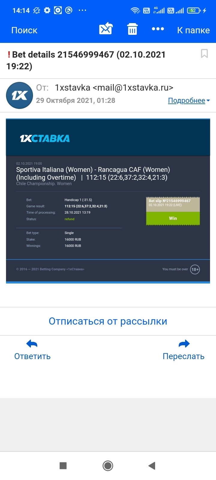 Работа по жалобе завершена. По информации от букмекера, возврат ставок сделан согласно п.п.3.5 , при этом претензий к качеству ставок у букмекера нет. Арбитраж Легалбет не считает возможным не выплачивать выигрыш по корректно принятым ставкам. Статус жалобы - не решено.