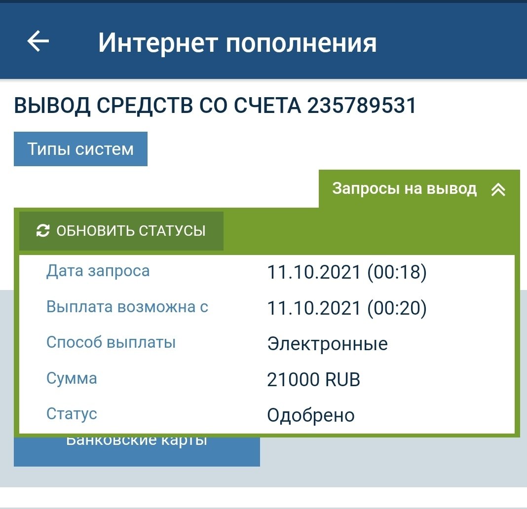 Спасибо за содействие. Пришел почему то отказ, деньги вернулись на счет, запросил еще раз, вывод пришел мгновенно.