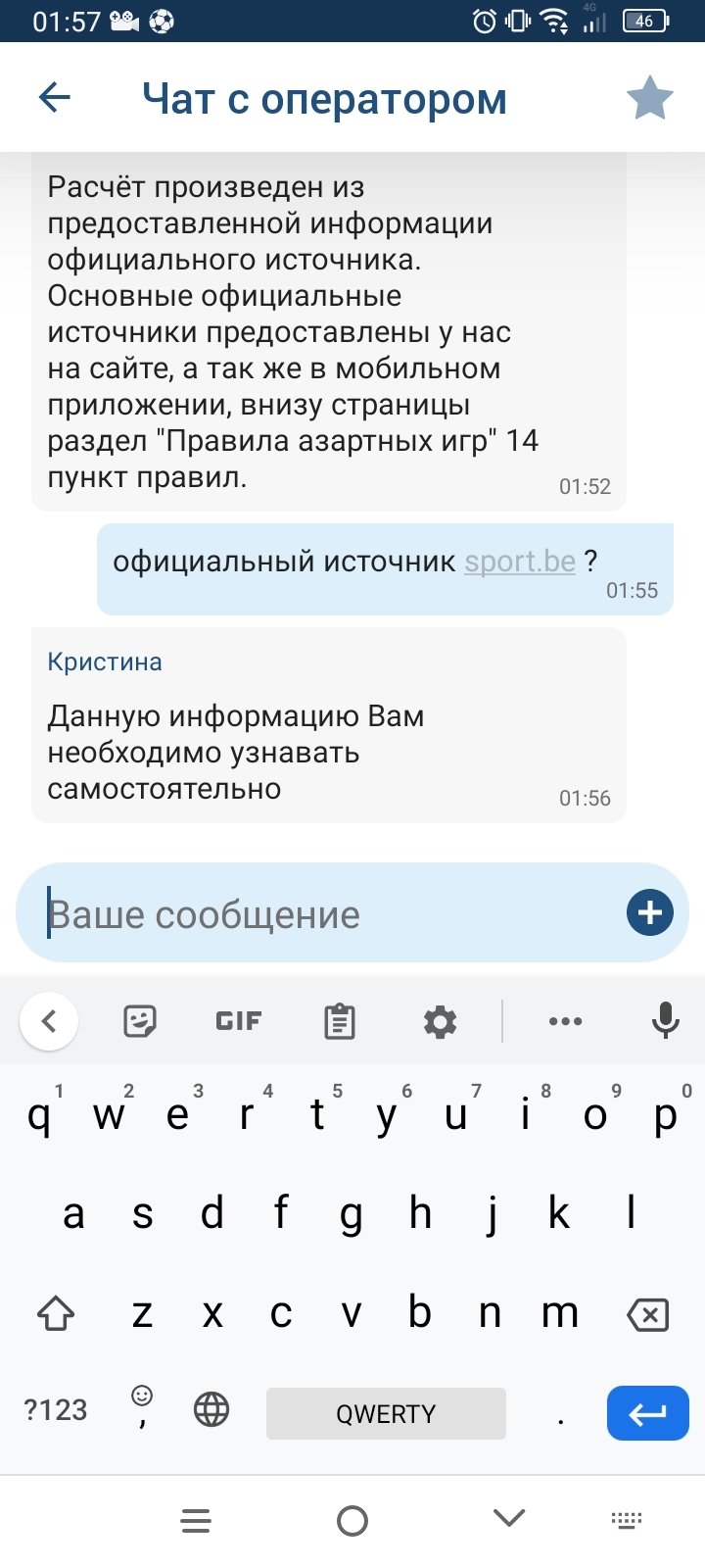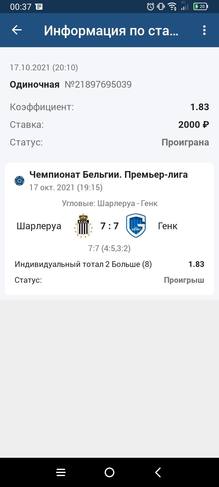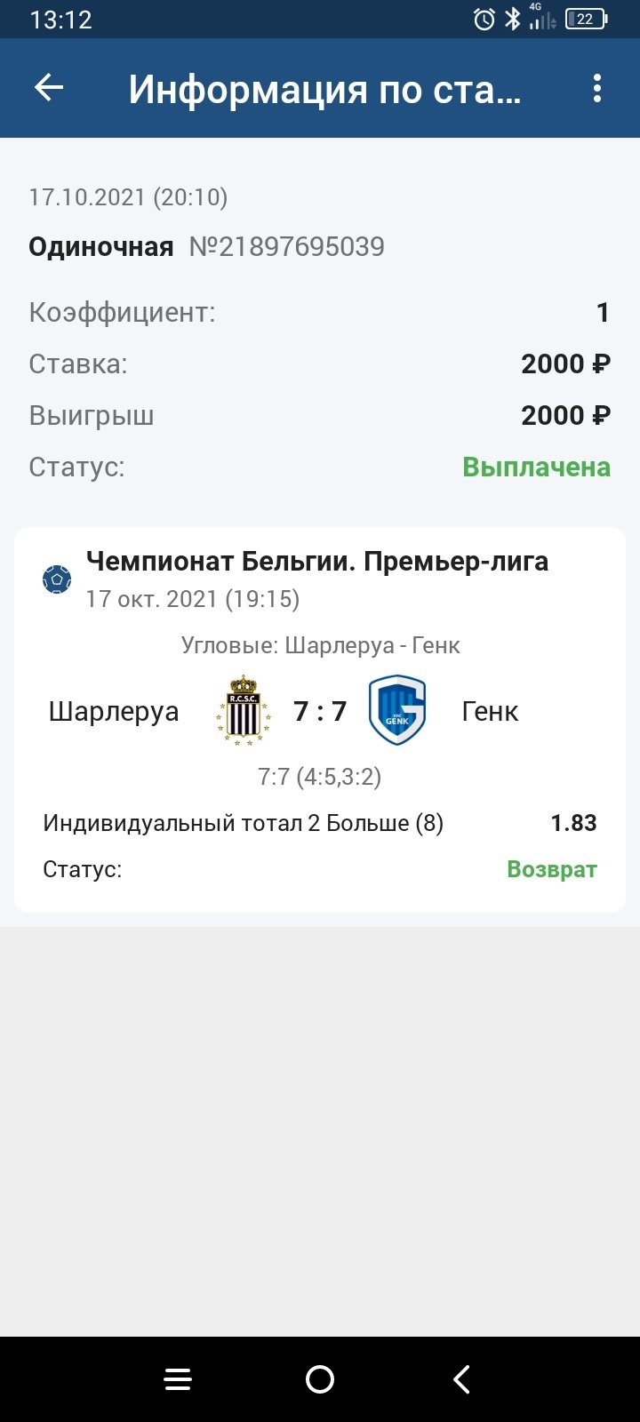 Добрый день. на платформе 1хставка было совершено пари за номером купона 21897695039,условием которого было колличество угловых ФК Генк больше 8,букмекер рассчитал его в колличестве 7 угловых,и закрыл ставку как проигрыш. Официальный сайт про лиги Бельгии даёт информацию о 8 угловых команды(скриншот прилагаю),так же и букмекер в текстовой трансляции указывает на угловой на 80 минуте (скриншот прилагаю),служба поддержки отказалась давать какие либо ссылки на официальные источники,кроме указанный в п правил( на нем нет никакой информации о данном матче),так же поддержка грубо завершила диалог отказавшись принять мои доводы.Прошу разобраться в ситуации.