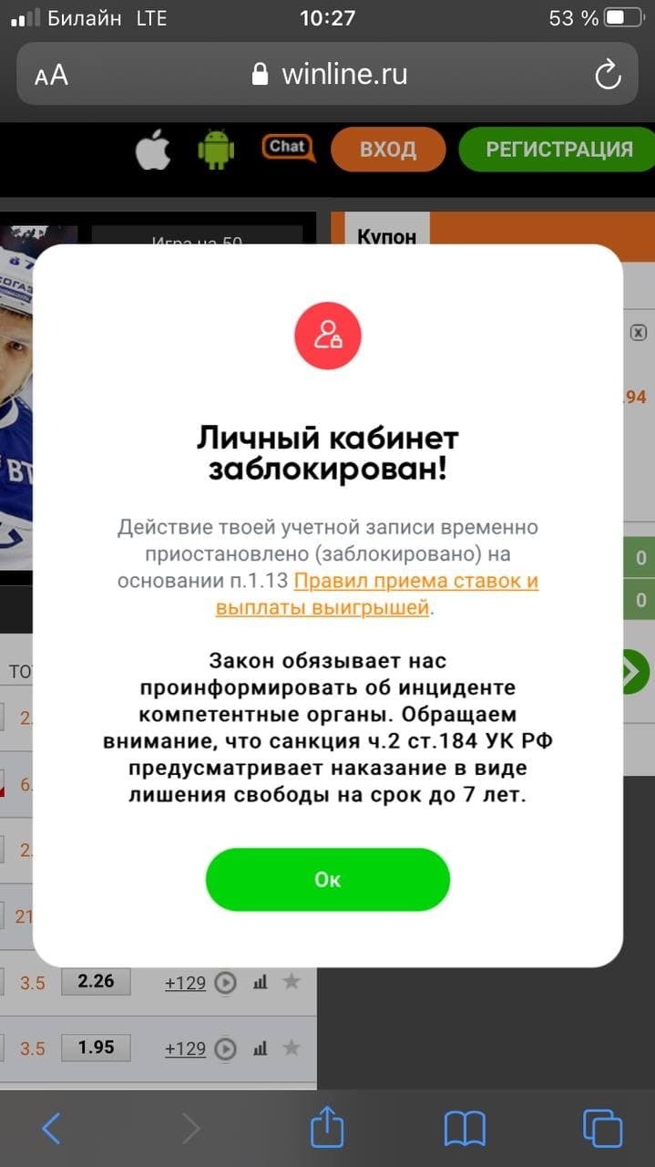 Информации, аргументирующей причины блокировки, от букмекера не предоставлено.