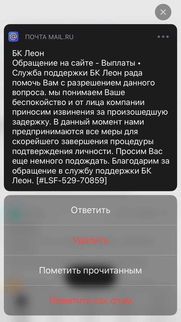 Здравствуйте. Меня зовут Рафаэль, я поставив разные ставки на кубок России по футболу, выиграл примерно 103 000 руб. Затем я хотел вывести деньги, но бк Леон отменила запрос, заблокировала счёт, запросили документы. Я все необходимые документы предоставил, бк ответила, что процедура верификации может занять до 30 дней. В общем стандартная процедура, все как у всех. С того дня прошло 28 дней, но от бк Леон никаких сообщений не приходило и не думаю что придёт именно 22 октября. Легалбет, без вашей помощи не обойтись, я думаю только вы можете посодействовать в том, чтобы они наконец-то мне написали и предложили пройти видеоверификацию, как и всем.