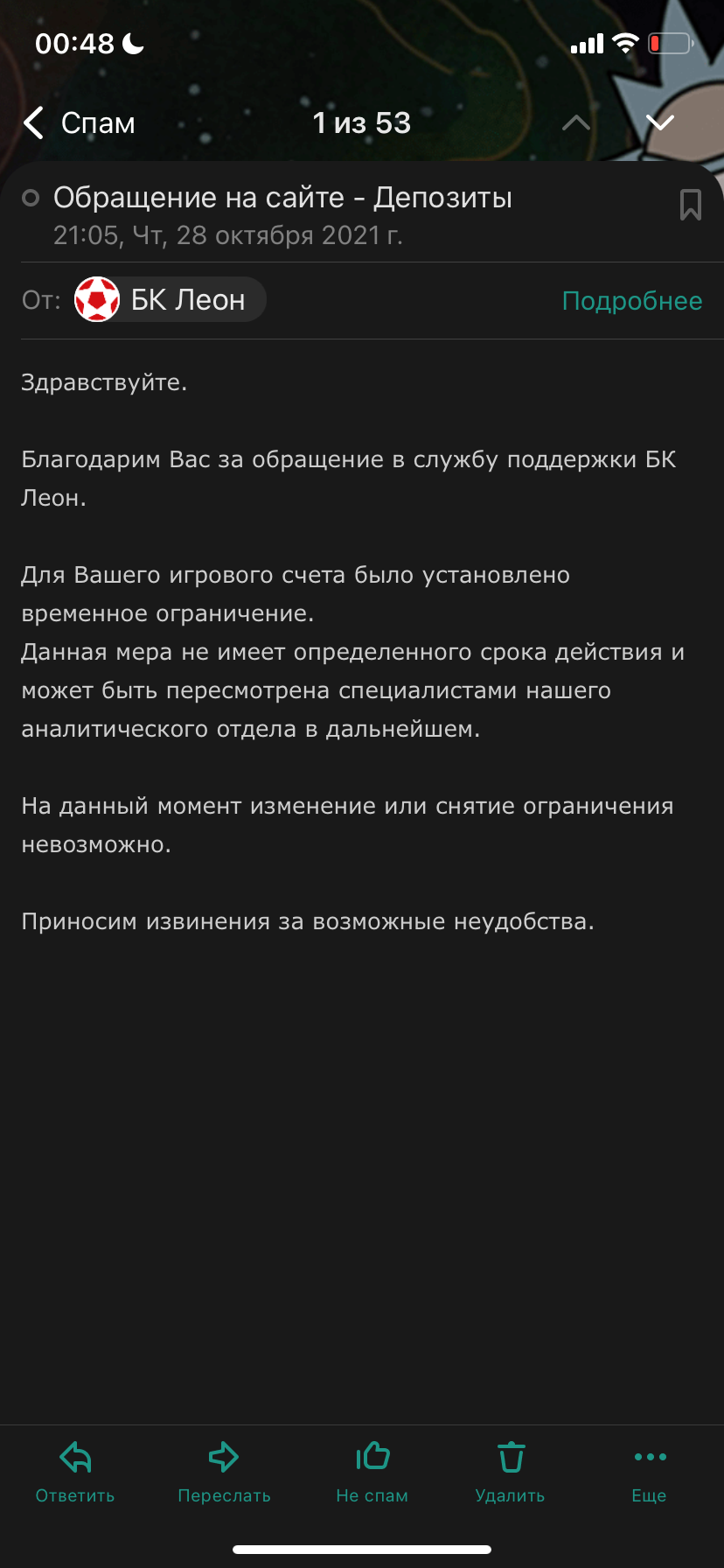 Зарегистрировался в БК Леон 24 сентября 2021 года и решил поставить на настольный теннис т.к. сам играю в него. Пополнил свой счет на 1000 (пополнял через платежную систему qiwi где пройдена верификация) и в скором времени проиграл (спустя 2 или 3 ставки), после пополнил еще раз на тысячу и уже смог пройти по восходящей к 11+- тысячам рублей. На радостях поставил 8,5 тыс. на вывод (на карту где мне отказали и попросили вывести на платежную систему qiwi) и лег спать с мыслью что большую часть выигрыша я заберу а остальное продолжу ставить. На следующий день захожу в БК и вижу что деньги так и не вывели… Заметил что после того как ушел спать мне пришло уведомление с просьбой предоставить документы. Я предоставил документы и пошел заниматься своими делами. В скором времени мне ответила поддержка и попросила предоставить фото карты на которую пытался вывести выигрыш. Все нужное для верификации предоставил. Прислали письмо о том что все хорошо ожидайте верификации. Прошло 3 дня - молчат. Ну подумал ладно, возможно завал и в порядке очереди пройду верификацию. Прошло примерно 10 дней все так же нет ответа. Решил написать в поддержку на почту. Мне пришел ответ где было написано, что верификация занимает 30 дней ровно. Я усомнился но решил подождать. Еще раз написал на почту ответ тот же. Остается пара дней до истечения установленного БК срока (30 дней), а ответа все так же нет… Последний день этого срока 25 октября.