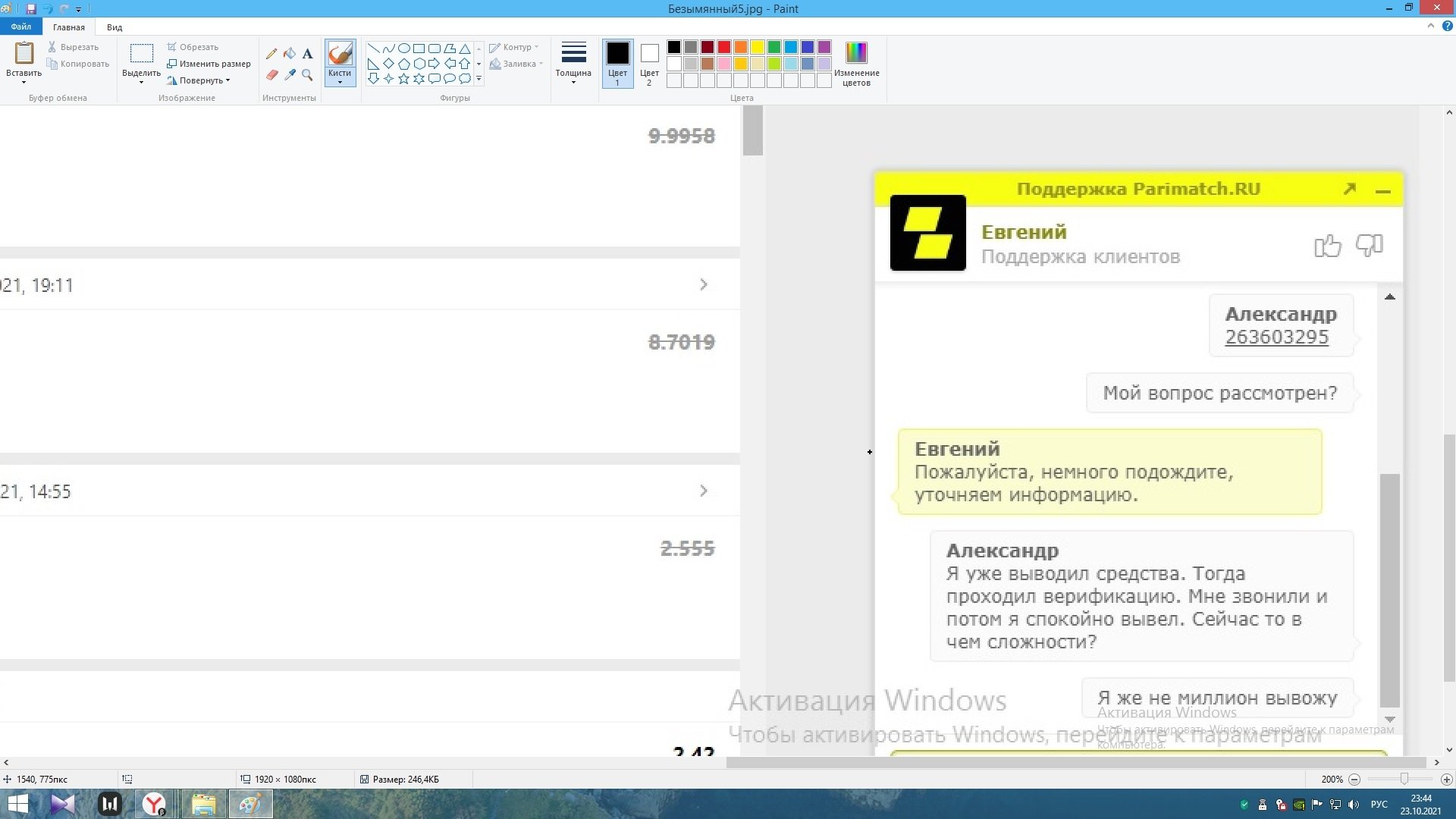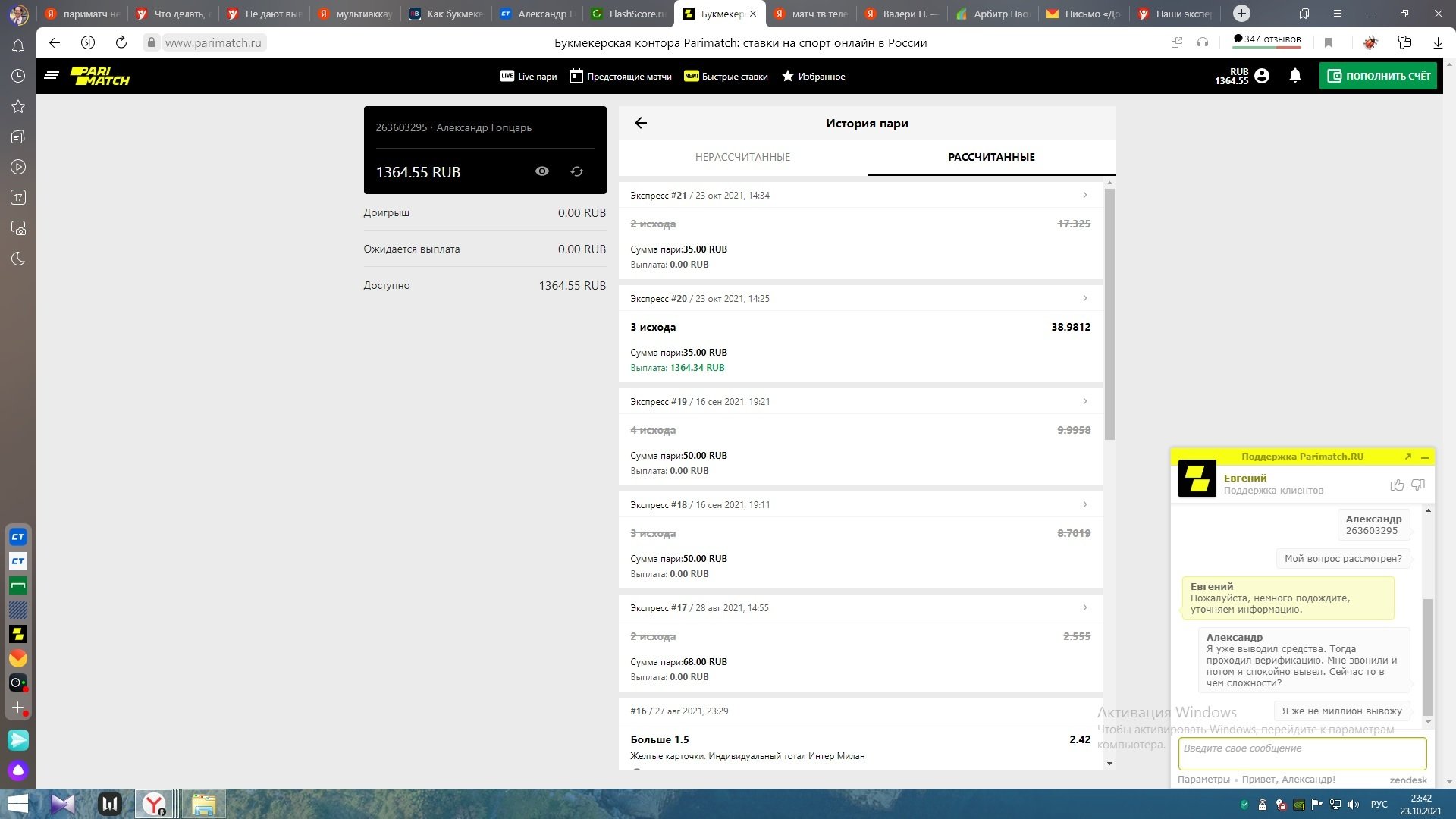 Сегодня закинул на счет в БК "Париматч" средства в сумме 70 руб. Поставил 2 экспресса. Один экспресс выиграл и я выиграл с экспресса 1364 руб. (все крины прилагаю, в том числе и чат и отказы в выводе средств). То есть со ставки в 35 руб. я выиграл 1364 руб. Но при попытке вывести или часть суммы или всей мне отказывают со ссылкой на п.п. №12.2 для вывода средств со своего игрового счета Клиент должен использовать всю сумму депозита. Не понял????Я внес депозит 70 руб. Поставил два экспресса по 35 руб. Один выиграл. Я должен сколько раз поставить? Или мне не дадут вывести пока я не проиграю?Что за бред? Заранее спасибо. Прошу рассмотреть жалобу