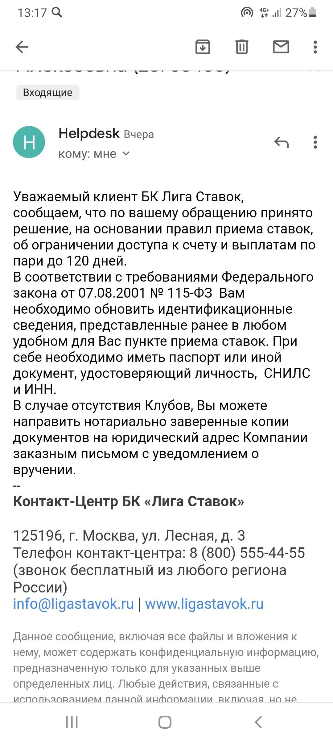 5 октября , ставила на настольный теннис и выигрывала с рублей 500 выйграла 3 тысячи с копейками , хотела вывести деньги и не смогла , наложили ограничение , после я не смогла даже зайти в личный кабинет пишут ваш аккаунт заблокирован , позвонила на горячую линию , мне сказали обратится в клуб в вашем городе , клуба в моем городе НЕТУ , сказали написать письменное обращение на почту , я написала , мне ответили что заявка будет рассмотрена в течение 30 дней , причину блокировки мне ни кто не озвучил , через 10 дней я решила позвонить и у знать долго ли ещё ждать , звонила не сколько раз в разное время суток мне ни кто не отвечал , писал в ЧАТ , на вопрос когда меня разблокируют отвечали что ждите , мы вам сообщим . Сегодня 25 октября , я снова решила написать в чат , на что мне ответили что моя заявка уже рассмотренна и я должна посетить или клуб или отправить документы письмом наттуриально . Сами они меня о их решение не предупредили . Правила я ни какие не нарушала , все честно. Как мне быть в такой ситуации?