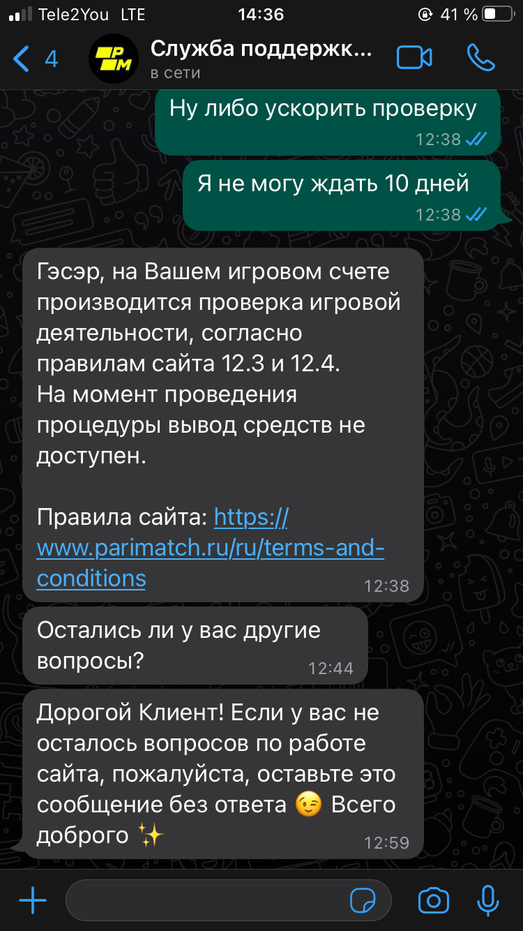Здравствуйте, отменили вывод на сумму 463362 рублей, ссылаясь на проверку игровой деятельности, букмекер не даёт вывести даже свой депозит 360000 рублей, пожалуйста помогите мне.