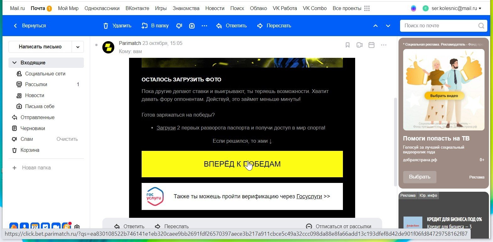 Здравствуйте. Можете скрин письма от Париматча с этой ссылкой выложить?