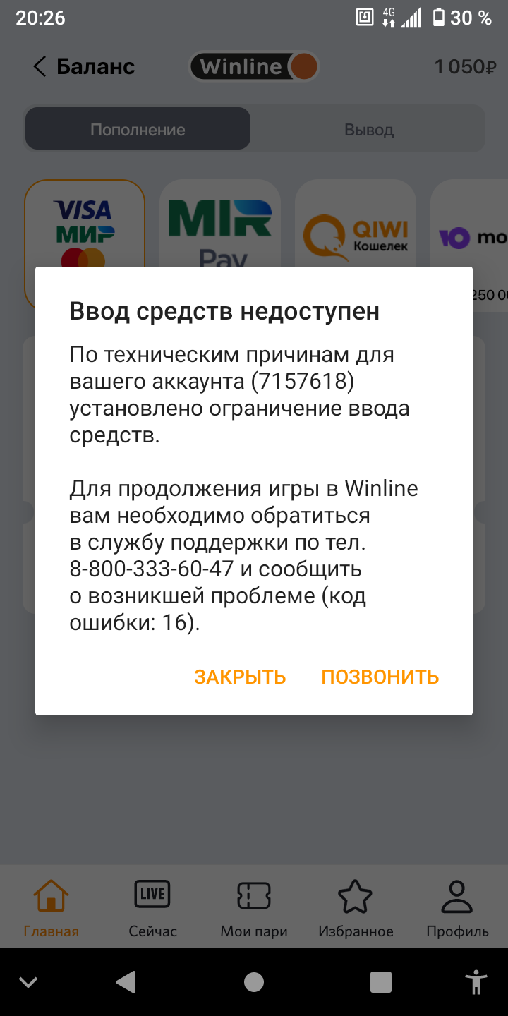 Не могу пополнить баланс пишет ввод средств ограничен код ошибки 16