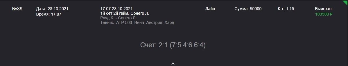 Ставил на победу в гейме Л. Сонего (он был подающим). Матч АТП 500 в Вене, приличная категория, топовые теннисисты играют. Так вот, поставил 90 тысяч на кф. 1.3, стало быть, кф вообще смешен итак, что я такими деньгами рискую, в спорте всякое может быть. Ну ладно, Сонего выиграл свой гейм, я выиграл ставку. Но вместо расчета по положенному кф 1.3, олимп перерасчитал мне стаквку на кф , что просто смешно)) Уже не в первый раз такое, забросил играть на этой конторе из за таких и не только идиотских перерасчетов (проигрышные главное они не делают возвратом ставки, даже если там были ошибки). Вернулся, ничего не изменилось)) Почему меня, если я рискую СВОИМИ деньгами и ставлю на один кф, должны волнвоать их ошибки и прочее, если я, проигрыв ставку на такой ошибочный кф, не получу возврат хотя бы? Если бы делали вовраты таких ставок ошибочных, был бы один разговор, а тут видите ли "мы ошиблись" (причем постоянно ошибаемся, обещаем не повторять такого, но сколько я не читаю времени про такое, года за 3 ничего не изменилось), все риски вы берете на себя