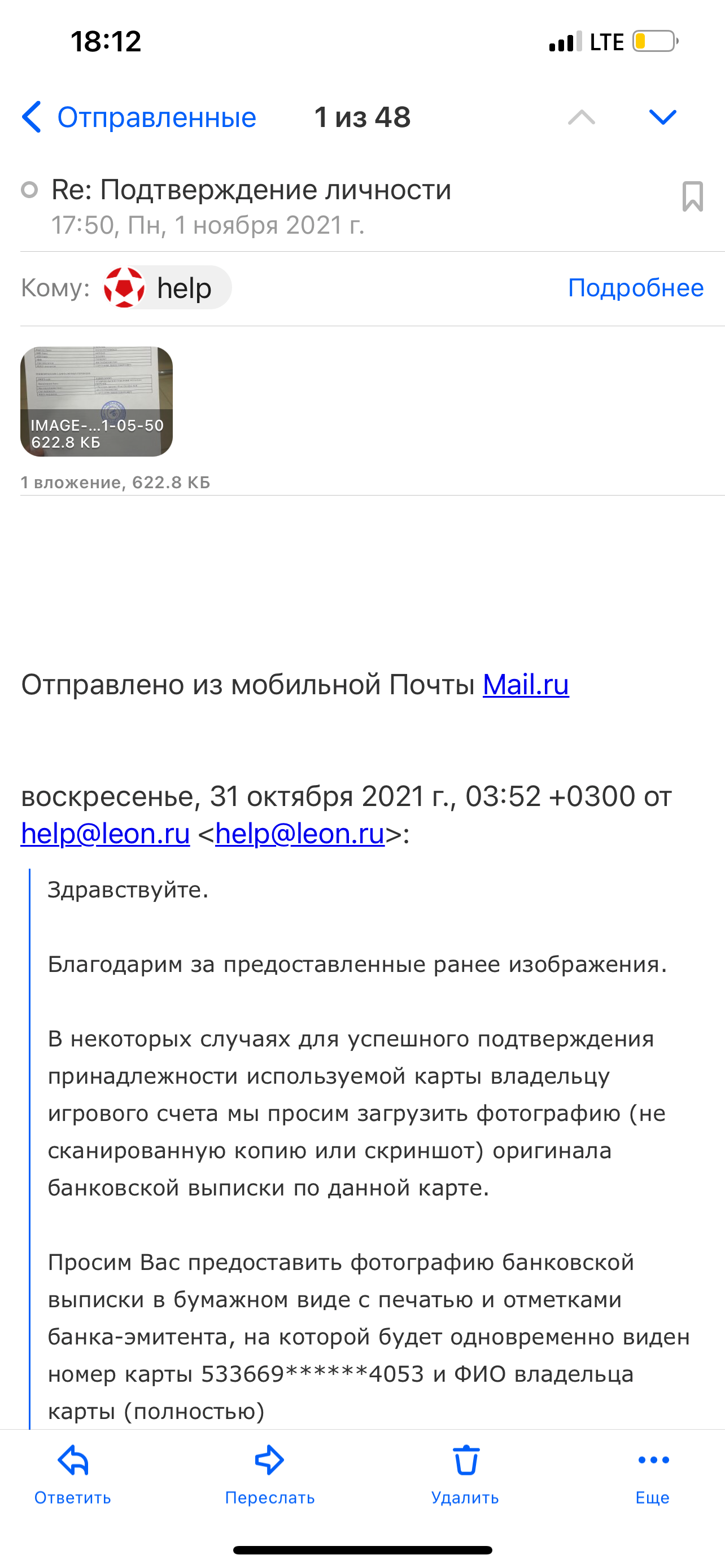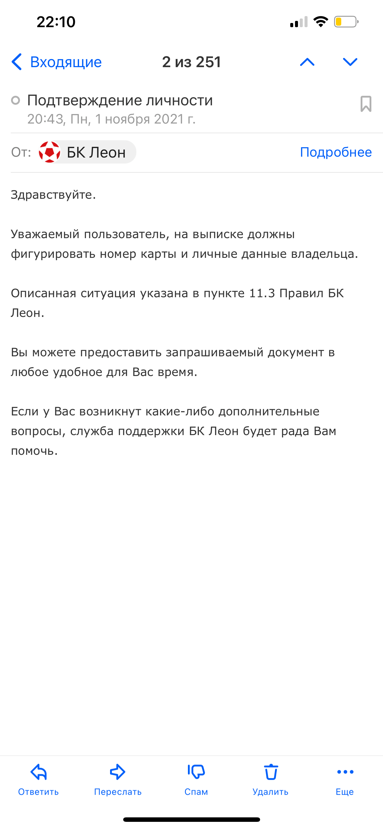 Доброго времени суток друзья, вот я и столкнулся с тем, во что не верил до последнего. Зарегистрировался в бк леон, пополнил счёт трижды на тысячу рублей, 2 проиграл по итогу вышел в плюс 14000, решил вывести свои средства и тут бум паспортные данные-отправил, банковскую карту 2 стороны-отправил, следующий этап они просят выписку по банковской карте-отправил выписку через Сбербанк онлайн, далее меня просят получить физический лист(выписку Сбербанка) где будет видно номер моей карты и ФИО, какой следующий этап ожидать ?и какова вероятность забрать свои деньги ? Собираюсь подавать в суд на букмекеры в случае мошенничества, все зафиксировано.