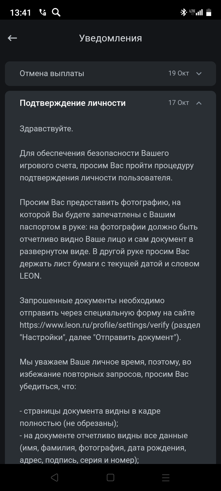 После того как я пытался вывести деньги, в приложении пришло УВЕДОМЛЕНИЕ!!! В нём просили фото с листком: дата и слово Леон. После как я им отправил фото ни одного письма или уведомления не приходило. Дней 10 тишина. Хотя неоднократно пытался им написать на почту