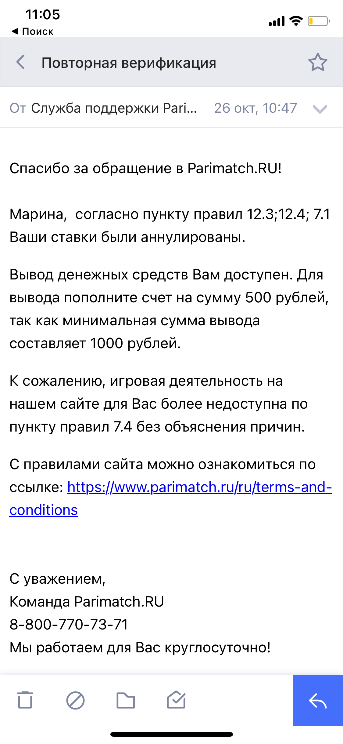 20 октября использовала приветственный фрибет в размере 1000 рублей на коэффициент , по итогу не дали вывести деньги. Попросили пройти верификацию, после которой заблокировали аккаунт и аннулировали ставку, сославшись на пункт 7.4, для чего тогда была верификация, непонятно. Помогите, пожалуйста, разобраться, никаких других правил я не нарушала, зачем тогда вообще делать этот фрибет, если его потом отбирают?