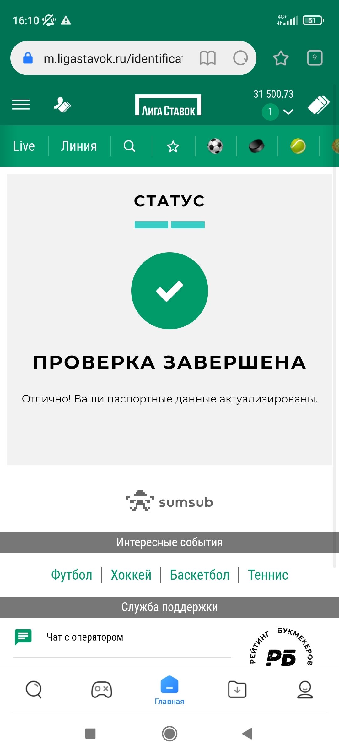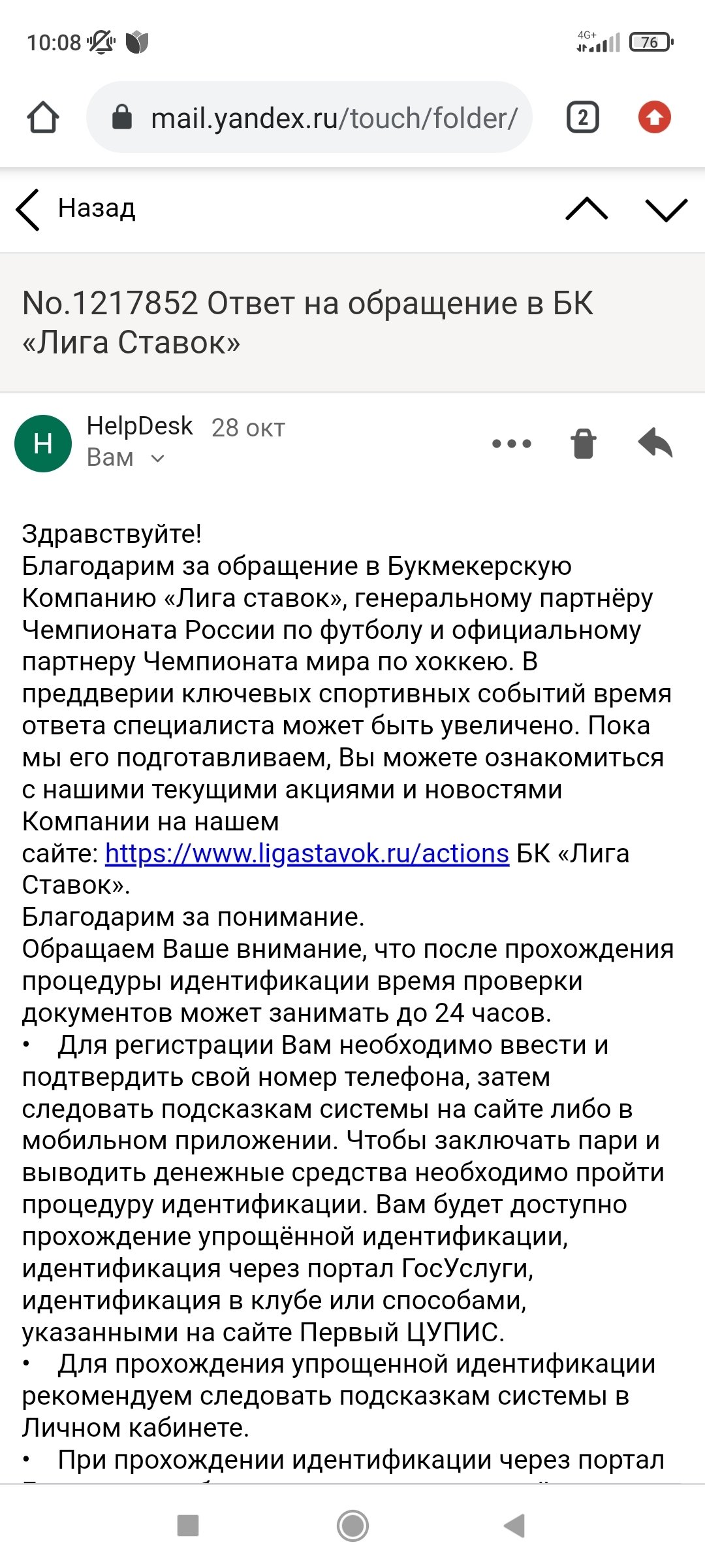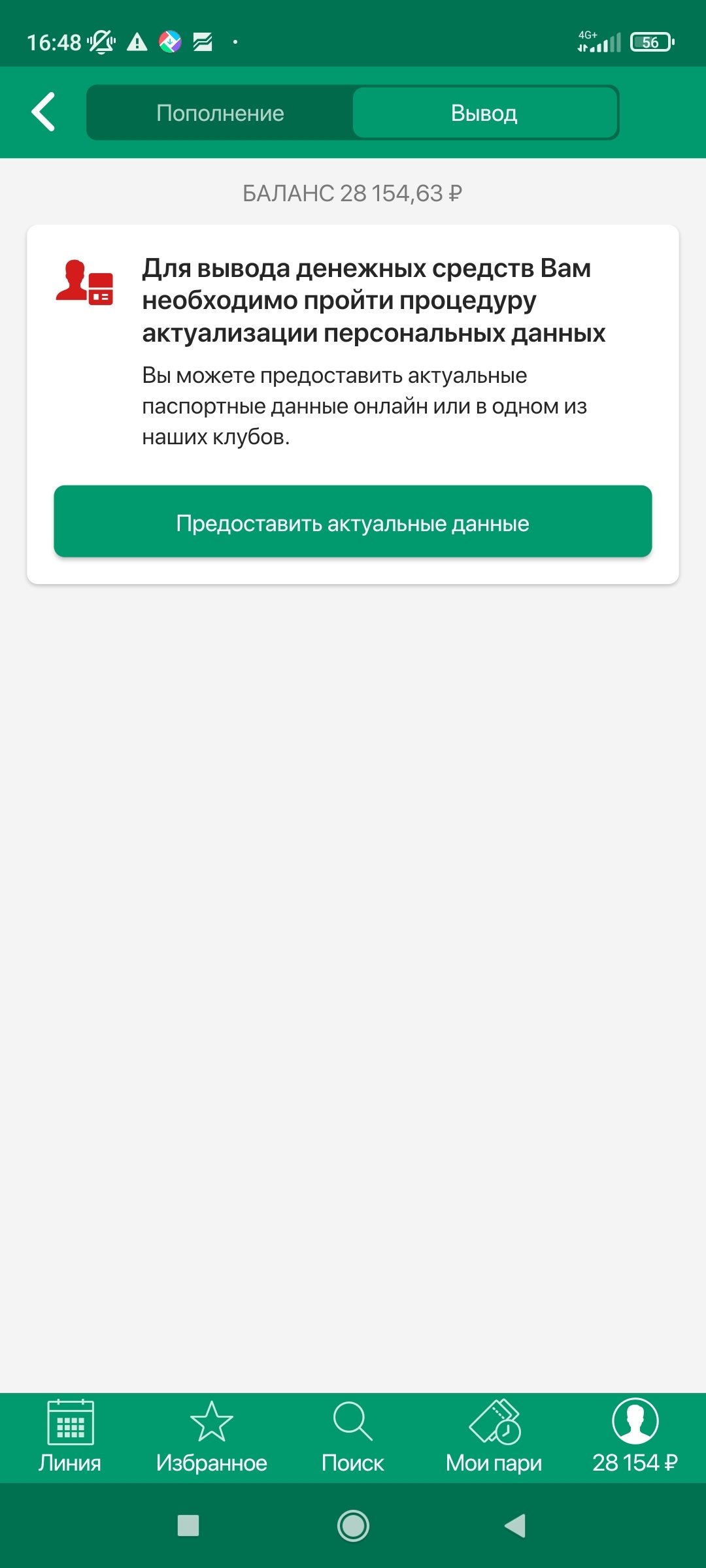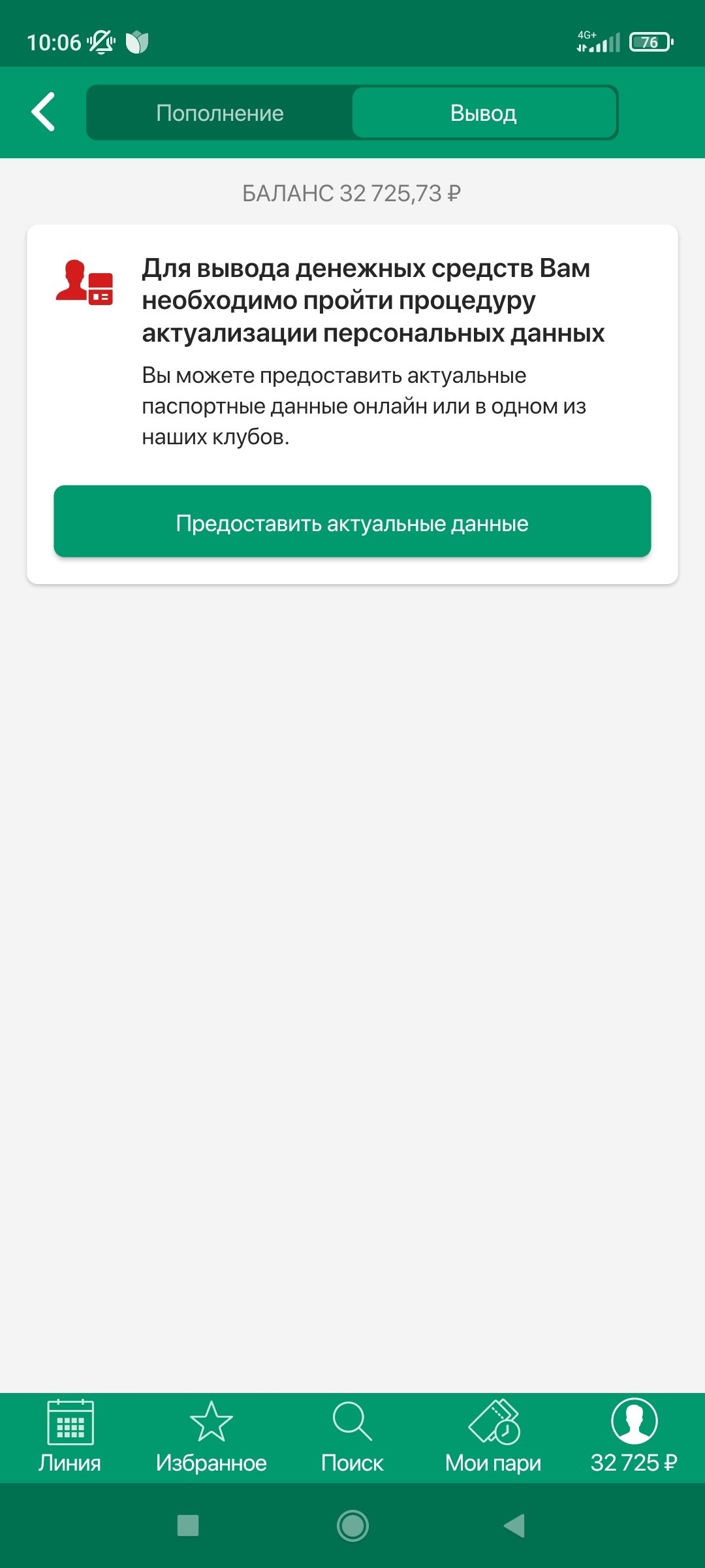 Добрый день. Неделю назад зарегистрировалась в Лиге Ставок, получила фрибет 500 р и сразу выиграла на футбольном матче 5000. После регистрации в цупис и минимальном пополнении 100 р без проблем сняла 2000 и продолжила делать ставки. После, в течение нескольких дней, вывела суммарно ещё 10000. Теперь не могу снять ни рубля, программа постоянно требует актуализацию данных, нажимаю "актуализировать", пишет, что все ок и снова все по кругу. Поддержка несёт откровенную чушь- сначала сказали, что это тех сбой и техники разбираются, вчера сказали только, что " мое обращение. Зарегистрировано " И они вообще не знают, когда все разрешится. Я думала, что это серьезная легальная компания, но прочитав отзывы, поняла, что это искусственно созданная ситуация и таких как я через одного клиента просто. Выигрыши, видимо, никому не выгодны. В поддержку звоню несколько раз в день и тут случается магия- во время телефонного разговора вывод становится доступен каждый раз буквально на секунду, но естественно за это время ничего не успеваешь снять. Легалбет, очень прошу помогите разрешить ситуацию! Эти деньги для меня очень важны, я заработала их своим умом и не понимаю,почему должна их подарить букмекеру. Аккаунт по номеру телефона 89511429538 Бутова Наталья Александровна