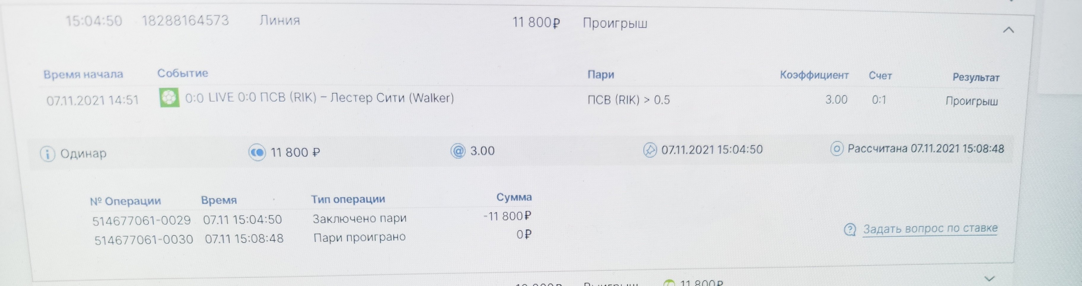 0:0LIVE 0:0 ПСВ (RIK) – Лестер Сити (Walker)матч закончился 1-1 ставка была больше 0.5 но ставка проиграла