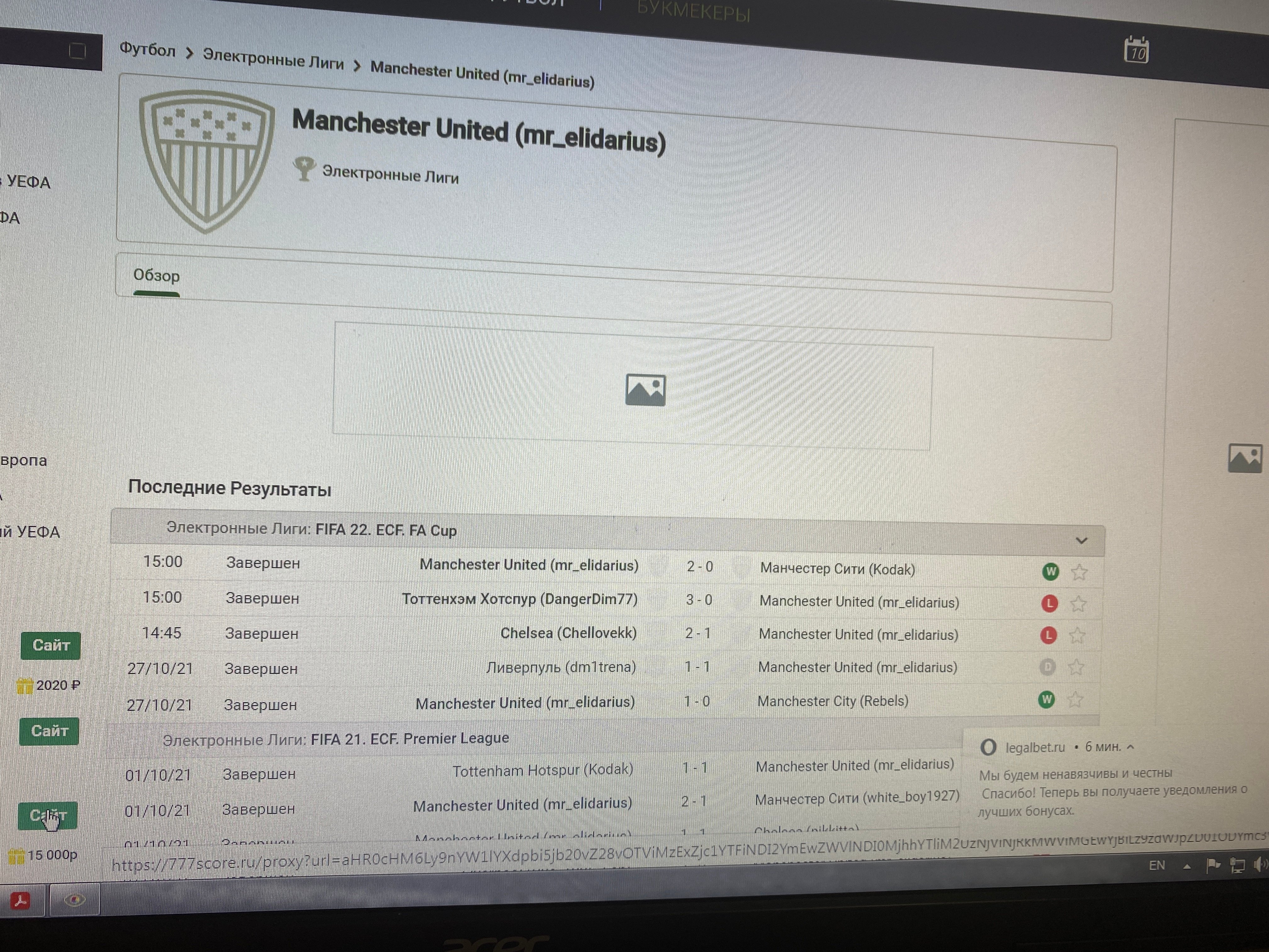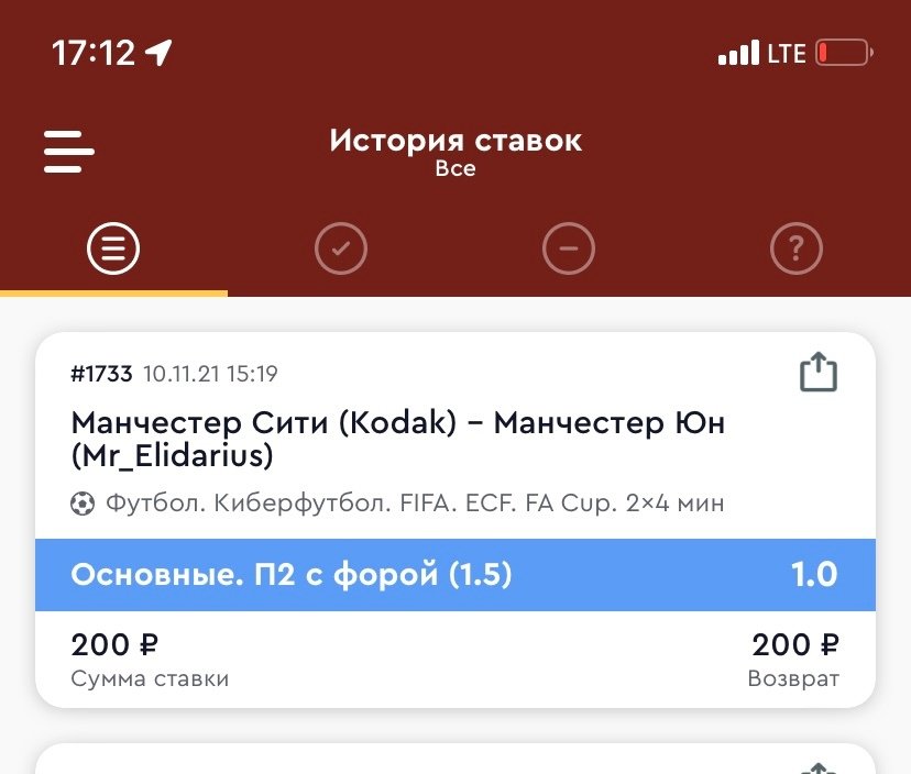 "Онлайн Футбол. Киберфутбол. FIFA. ECF. FA Cup. 2x4 мин Манчестер Сити (Kodak) - Манчестер Юн (Mr_Elidarius): Основные. П2 с форой (1.5)" Расчет произведен возвратом согласно пункту правил 9.13 д Букмекерская контора оставляет за собой право отменить ставки, поставленные на некорректные (нерыночные, ошибочные) коэффициенты и вправе (но не обязана) по своему усмотрению пересчитать такие ставки по корректному (правильному, рыночному) коэффициенту выигрыша. При этом значение корректного (правильного, рыночного) коэффициента выигрыша Букмекерская контора вправе определять по своему усмотрению. Некорректным (нерыночным, ошибочным) коэффициентом выигрыша считается коэффициент выигрыша, соответствующий хотя бы одной из нижеперечисленных характеристик: д) коэффициент выигрыша не соответствует текущему времени и/или счету в матче.