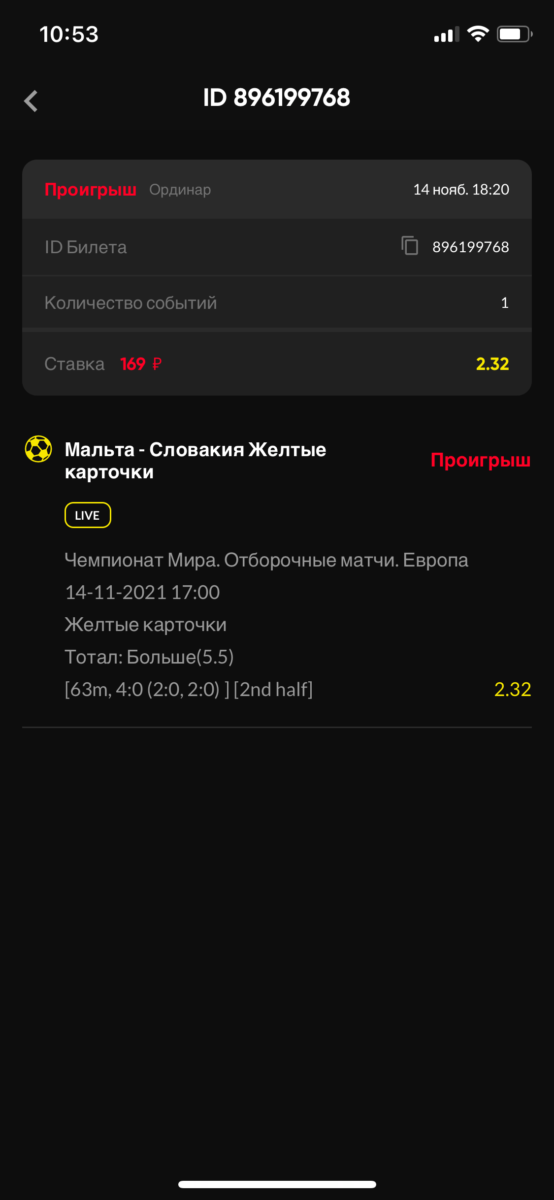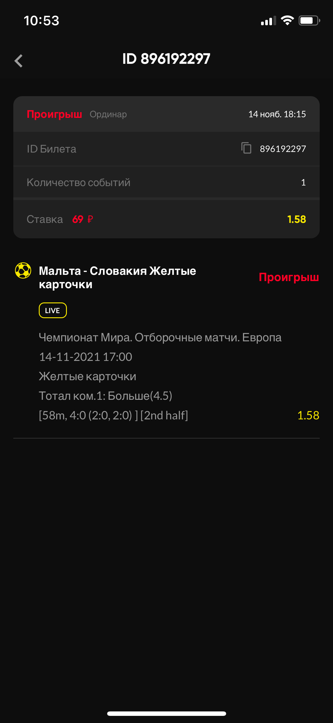 Доброго времени суток. Ставил в бк бетбум в Лайве через приложение на желтые карты в матче Мальта - Словакия. Было несколько ставок: тб1 4.5; тб5.5 общий, тб 4.5 общий. Официальный протокол матча сообщает о 6 желтых картах, тех поддержка - чат - отвечала о технических работах на сайте. Часть ставок вернули с кф 1, часть выплатили, ставки на ЖК рассчитали как проигрыш. Специалист сообщает о 4 желтых картах в матче.