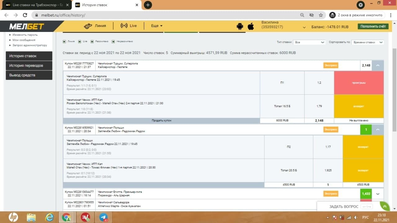 здравствуйте , перерассчитали ставки купоном по кф 1, но самое главное выигрышный купон мне вернули полностью по кф 1, проигрышны- то что выигрышем возврат, то что проигрышем в проигрыш. Это не справедливо и глупо! Очень плохая контора! Главное позавчера там проиграла 5 тыс, им без разницы, деньги они получили, сегодня выиграла 3500 - их обнулили, а второй купон в проигрыш! пишут ошибка в коэффициентах! Где там ошибка? кф 1.9 может быть ошибочным на тотал больше? когда он примерно равен с кф на ТМ. делеют что хотят, никому эту контору не порекомендую