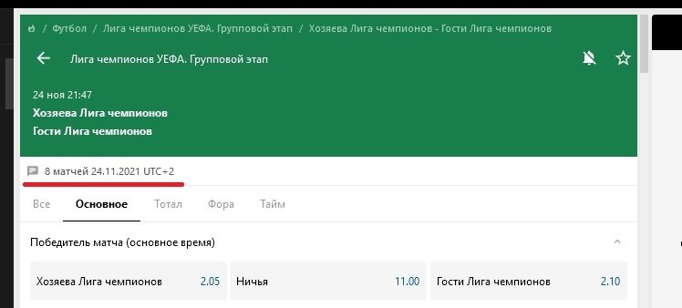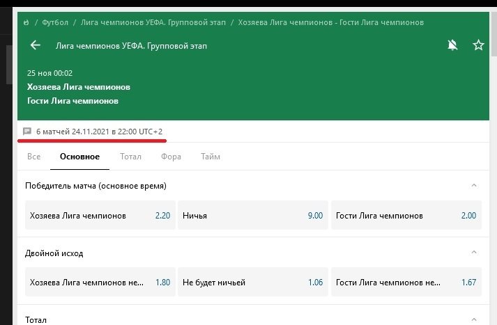 Вчера сделал ставку на исход хозяева ЛЧ против гостей ЛЧ на победу гостей. Согласно правил бк победа учитывается по количеству голов, забитых хозяевами или гостями. У бк в линии указано было 2 одинаковых события, но с разным временем. У меня разница с мск +5 часов. Линия указывалась таким образом - сначала идут матчи в (время здесь и далее местное), затем указан в о событие Хояева ЛЧ против Гостей ЛЧ, затем идут оставшиеся 6 матчей, которые начинаются по времени в , и затем снова указано событие Хозяева против Гостей ЛЧ, но уже время . По линии интуитивно понятно какие матчи в какой хронологии пойдут в учет, т.е. по матчам которые начались в , событие хозяева против гостей сыграет после того как завершатся ВНИМАНИЕ - только 2 матча, а не весь тур, а для событий в (оставшиеся 6 матчей) применяется событие Хозяева против Гостей, только уже по времени в ! Бк говорит что нужно ориентироваться на весь тур, я считаю что если линию указали таким образом что логично предположить что после каждой серии матчей указан исход Хозяева против Гостей, должны учитываться ВСЕ указанные выше события до события Хозяева против Гостей. Данное обстоятельство никак не урегулировано правилами, а значит должно толковаться в пользу клиента как более слабой стороны в правоотношении! Прошу принять меры!