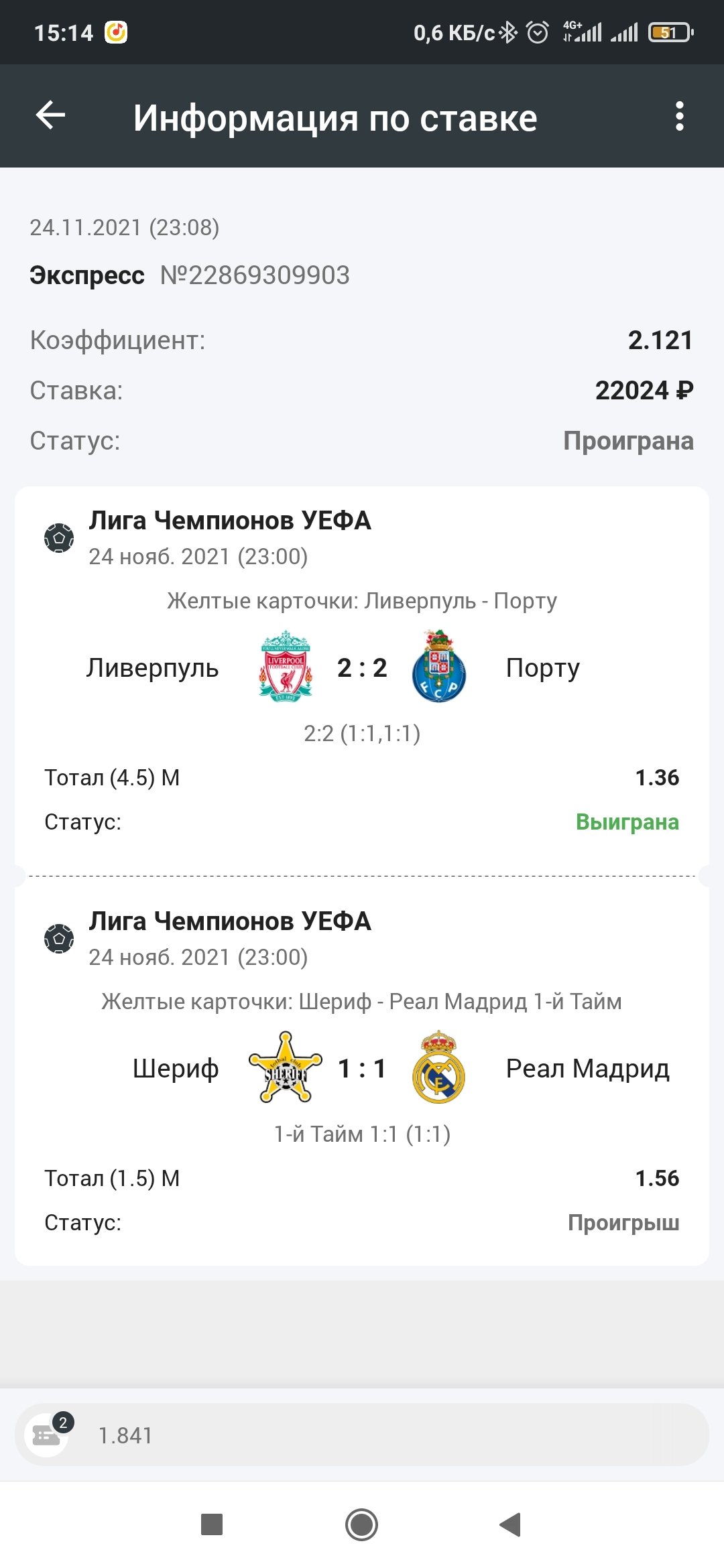 Купон 22869309903 Матч Шериф - Реал Мадрид Время ставки 23:08, 8 минута игры. Ставка на Тотл жёлтых карт на 1 тайм На момент ставки счёт жёлтых карт был 0:1 На сайте указали счёт 0:0 и установили линию относительно этого счета. Принимались ставки на 1 тайм Тотл 0.5 больше(коэф~) - меньше(коэф~) и Тотл 1.5 больше (коэф ~2.5) - меньше (коэф. 1.5). Согласно пункту правил мелбет (. В случае ошибок персонала, несоответствии коэффициентов в линии вероятности исхода события (опечатки в предлагаемом перечне событий, несоответствии коэффициентов и т.п.), при наличии доказательств неспортивной борьбы, при отступлении от настоящих Правил при приёме ставок, а также при других аргументах, подтверждающих некорректность ставок, объявить ставки на таких условиях недействительными. Выплата по этим ставкам производится с коэффициентом «1». Несоответствие коэффициентов в линии вероятности исхода события определяется согласно внутренним критериям Организатора пари.) Ставка должна была быть рассчитана с коэффициентом 1 из за ошибки персонала, несоответствия коэффициентов в линии вероятности исхода события (опечатки в предлагаемом перечне событий, несоответствии коэффициентов и т.п.) Прошу помочь разобраться с этой ситуацией. БК игнорирует факт ошибки и отказывается менять расчет.