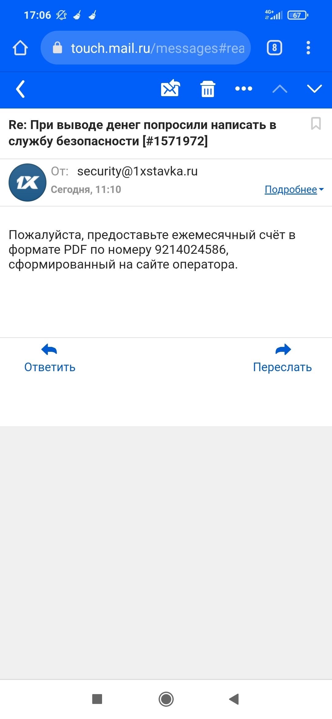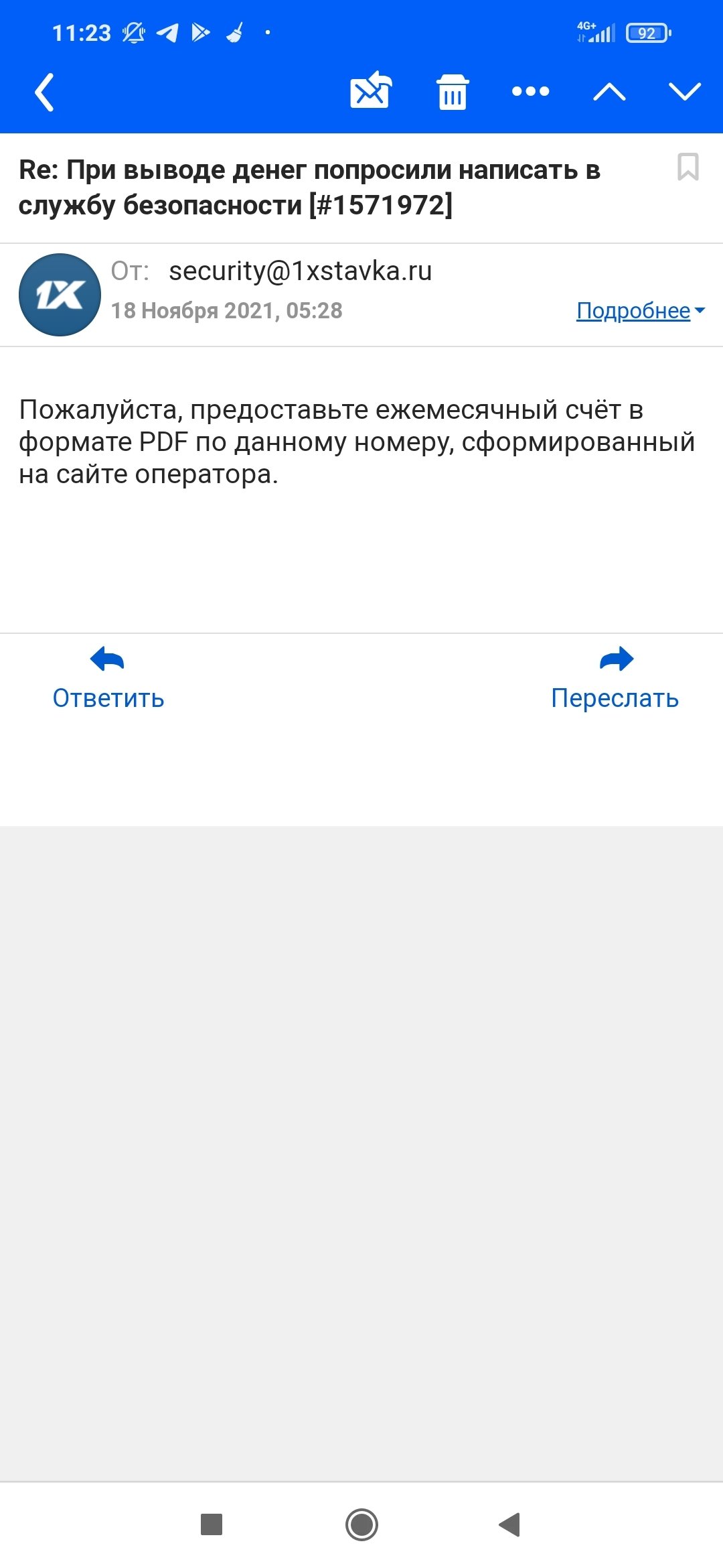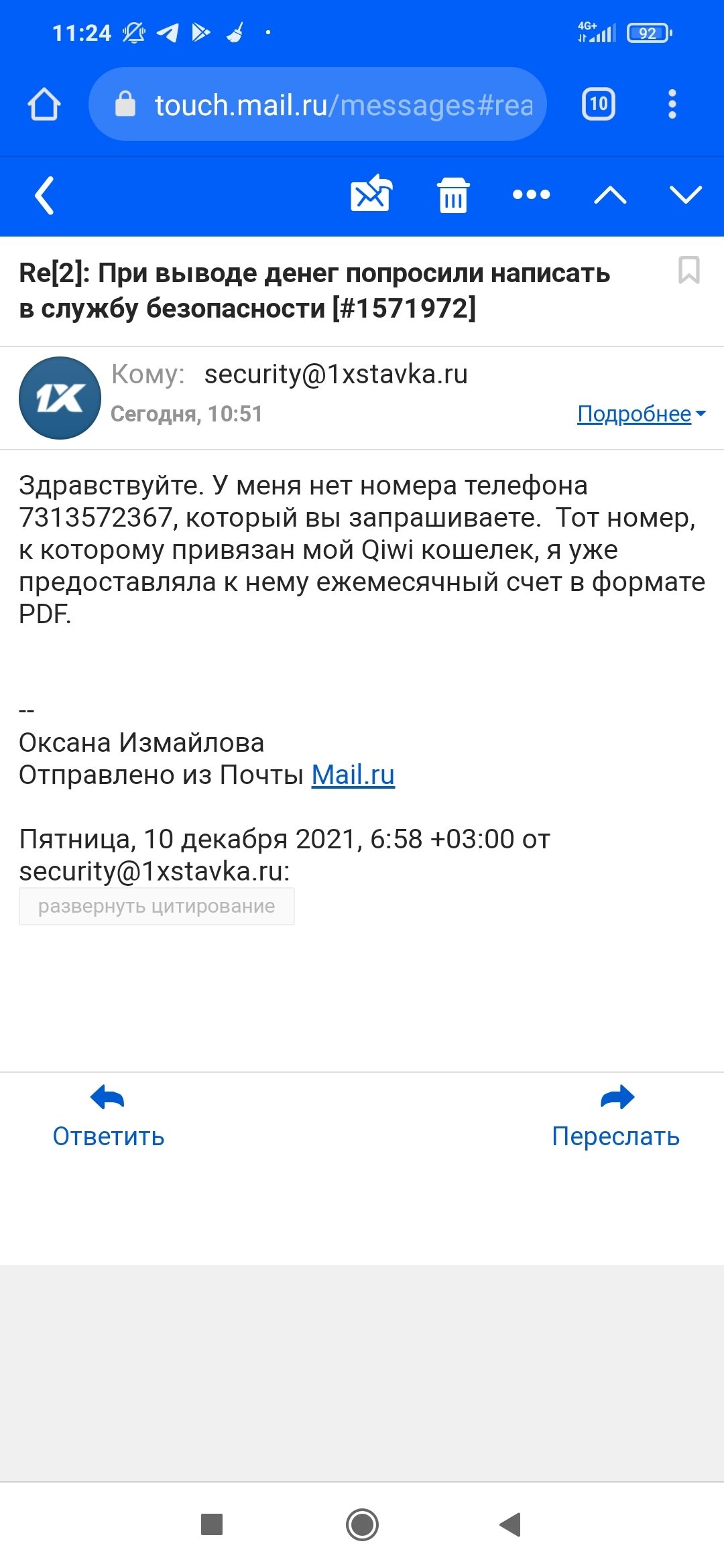 Сегодня в 06:58 1xstavka запросила счет, но указали неизвестный мне номер. Я им ответила (в 10:51), что номер, который они указали, мне не принадлежит, на что в ответ они запросили в 11:10 счет на мой номер 9214024586, который привязан к QIWI кошельку, счет на который я предоставляла еще 18 ноября. (скрины переписки прилагаются)