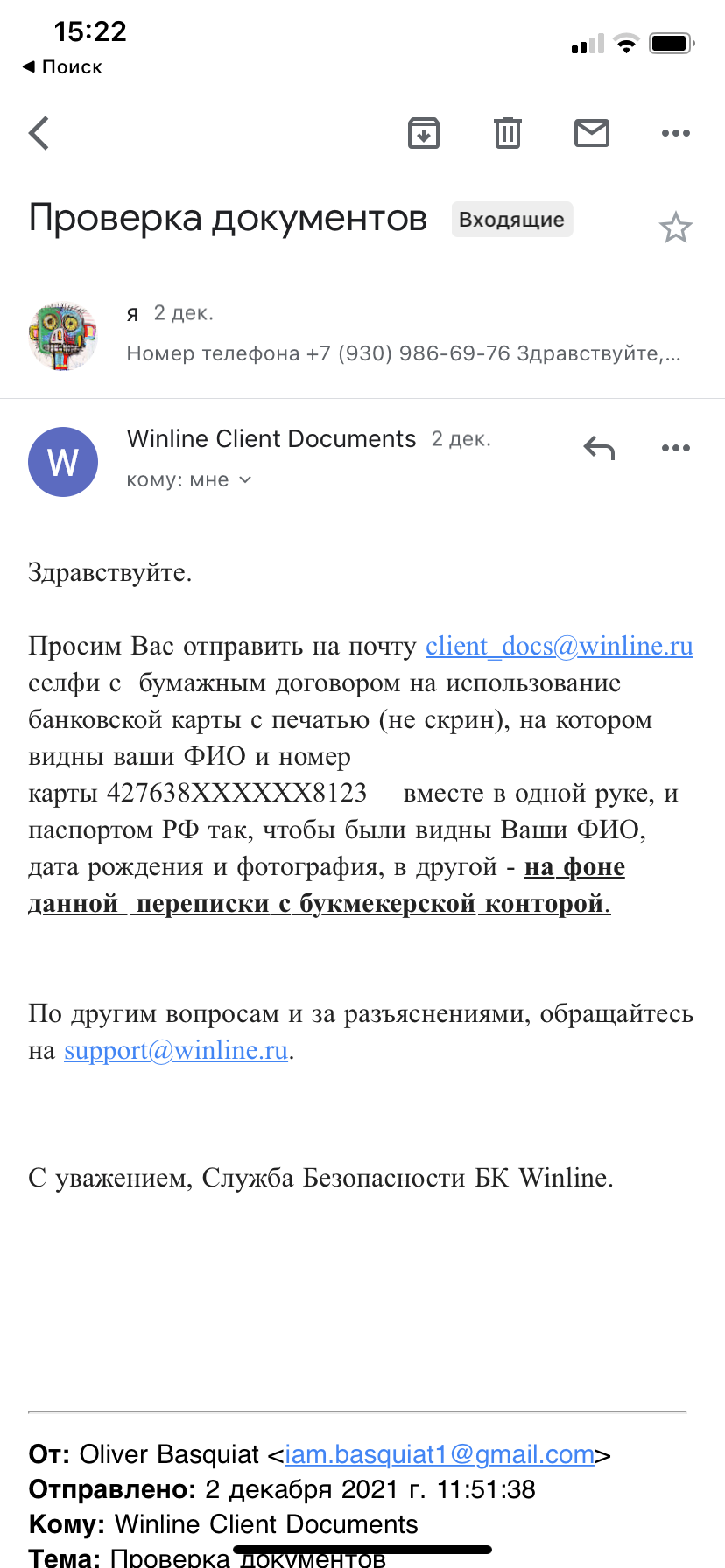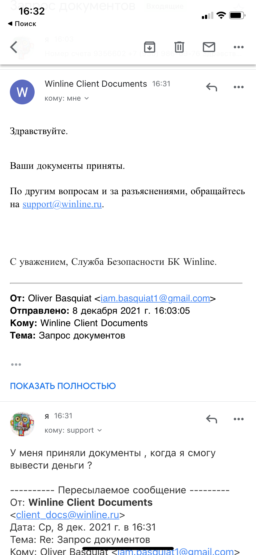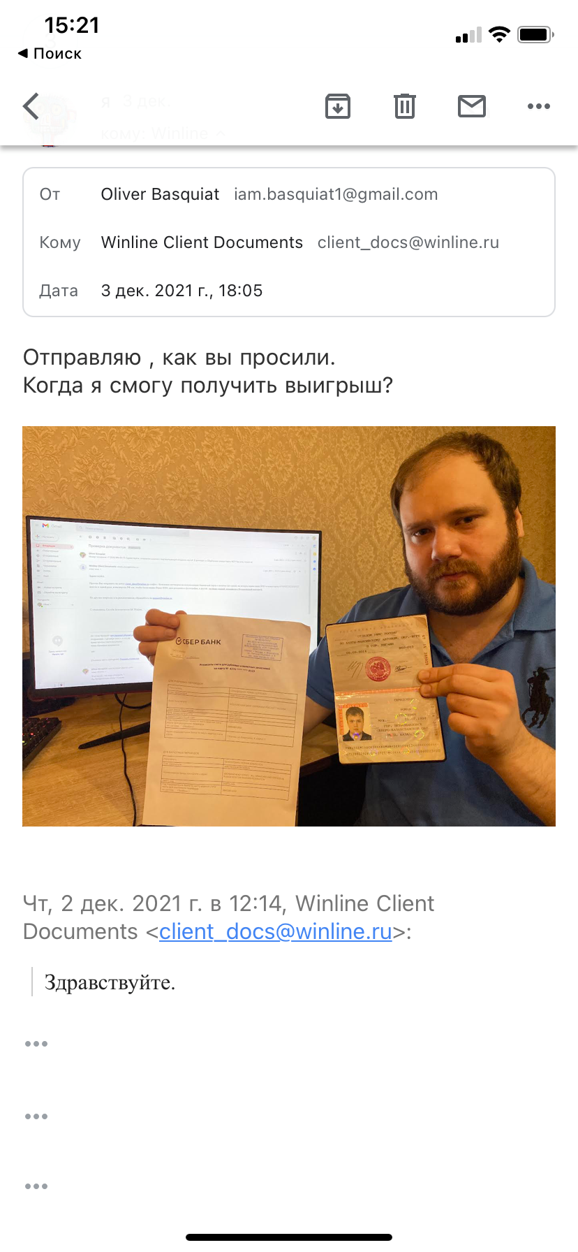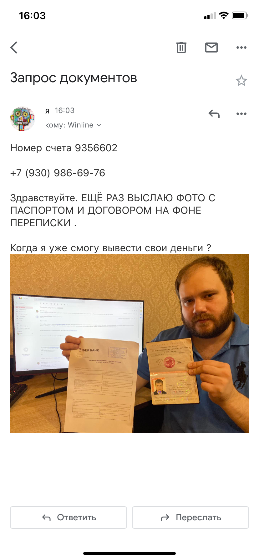 Компания Винлайн не видит деньги , не отвечает на телефон и почту. Неделю назад я оправил фотографию договора на банковскую карту на почту , который у меня запросили… После чего Виролайнен запросил фотографию с договором на фоне переписки. 3 дня назад я выслал ее , но ответа не последовало. На звонки Бк винлайн не отвечает. Дозвониться НЕВОЗМОЖНО !!! Попробуйте сами… на почту тоже не отвечает Прошу помочь в решении вопроса